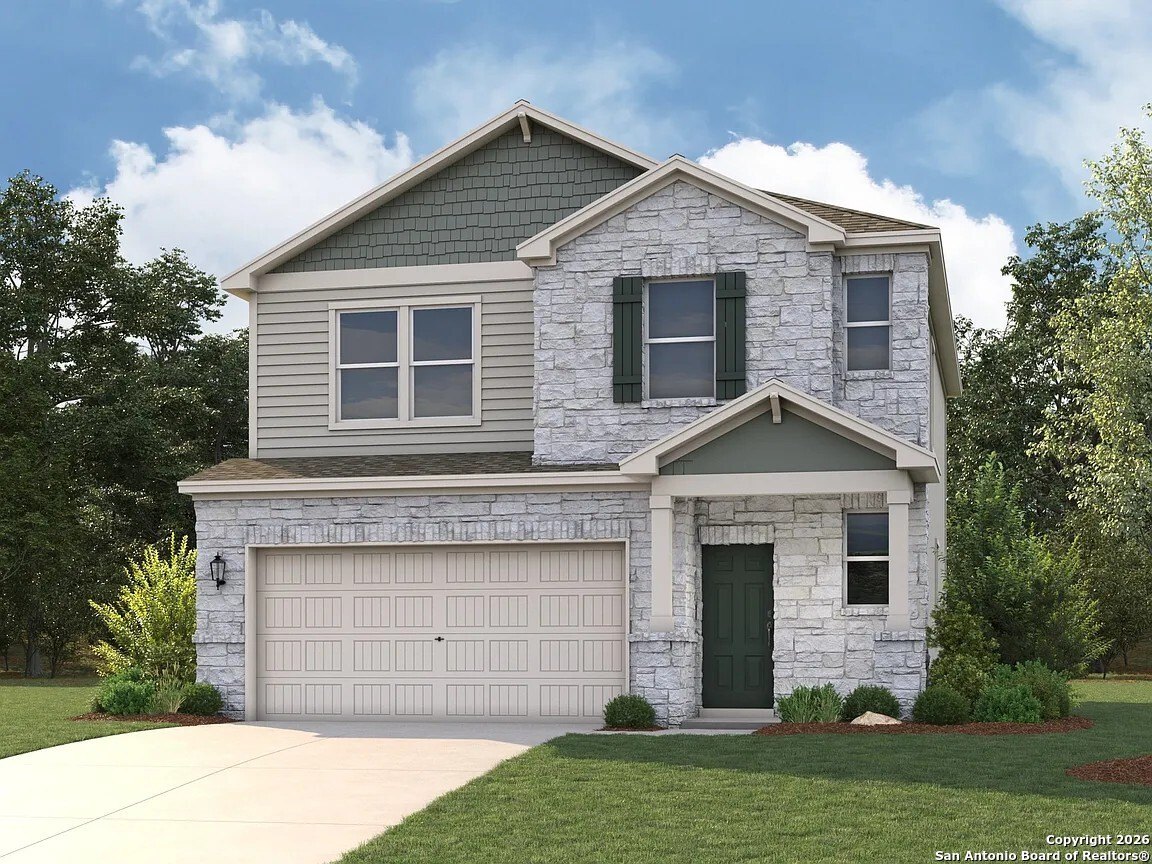 Introducing The Lakeway floorplan, a stunning single story home located in Brookstone Creek in San Antonio, TX. The Lakeway is sure to impress with its classic front exteriors, 2-car garage and 2034 square feet of living space spread across 4 bedrooms, 3 bathrooms and a study. As you enter the spacious foyer you’ll see the open study, a guest bedroom, and second full bath at the front of the home. Passing through the foyer, you’ll find yourself in the grand combination dining room, kitchen, & living room. The Lakeway kitchen offers quartz countertops, stainless steel appliances, a natural gas cooking range, shaker style cabinets, a corner walk-in pantry and a large kitchen island with a deep, single bowl sink that faces the wide open living room. Located privately off the dining room are the remaining secondary bedrooms and a third full bath. All secondary bedrooms are complete with quality carpet, windows and closets. The private main bedroom is located at the back of the home and includes carpet flooring, large windows for plenty of natural light, a ceiling fan and a spacious ensuite bathroom. Complete with double vanity sinks, a walk-in closet and a spacious walk-in shower with tile surround, this ensuite bathroom is your very own oasis. Additional features include a back patio that overlooks a fully landscaped and irrigated yard, hard surface flooring at entry, downstairs halls, living room, kitchen, and dining/breakfast area, tile in all bathrooms and utility room, pre-plumb for water softener loop and faux wood window blinds throughoutt. This home includes our HOME IS CONNECTED base package. Using one central hub that talks to all the devices in your home, you can control the lights, thermostat and locks, all from your cellular device.