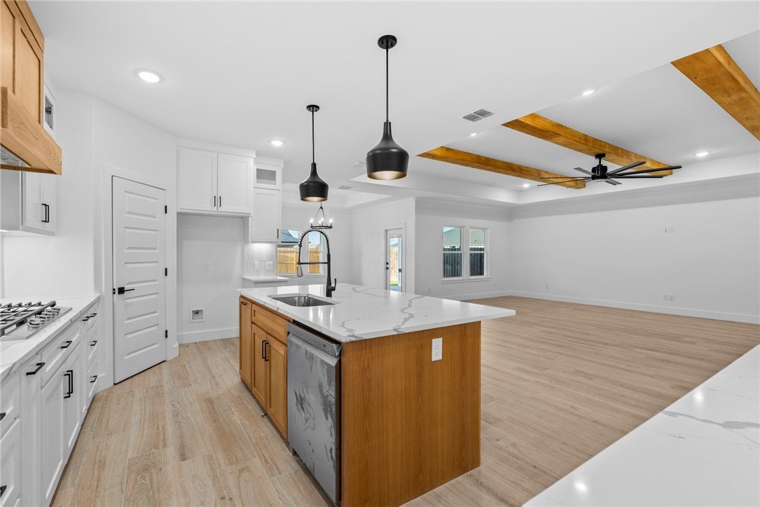 Property Description: Welcome to 1454 Sansa, a striking new construction by the renownedDevonshire Custom Homes, located in the prestigious King's Landing subdivision within the highly sought-after London ISD. This thoughtfully designed home spans approximately 2,644 square feet and offers 4 spacious bedrooms and 3 full bathrooms, blending modern elegance with the exceptional craftsmanship Devonshire is known for. From the moment you enter, you'll notice the attention to detail, soaring ceilings, a beautifully beamed living room ceiling, and designer light fixtures that set a sophisticated yet welcoming tone. The open-concept floor plan creates an effortless flow between the living, dining, and kitchen areas, making it ideal for both everyday living and entertaining. Large windows bathe the interior in natural light, highlighting the clean lines, rich finishes, and custom millwork throughout. The gourmet kitchen is a showstopper with custom cabinetry, premium countertops, a generous island, and high end fixtures, offering both style and functionality. The private owner's suite features a spa-like bath and walk-in closet, while three additional bedrooms provide ample space for guests, or a dedicated office. Step outside to a covered patio and expansive backyard, offering endless possibilities for a future pool, outdoor kitchen, or lush garden retreat. Situated in one of Corpus Christi's most desirable communities, this property provides easy access to shopping, dining, and city conveniences while maintaining the peaceful feel of a well-planned neighborhood. Don't miss the chance to own a brand-new, fully customized Devonshire masterpiece in London ISD. Schedule your private showing today and experience the perfect balance of refined design and everyday comfort.
