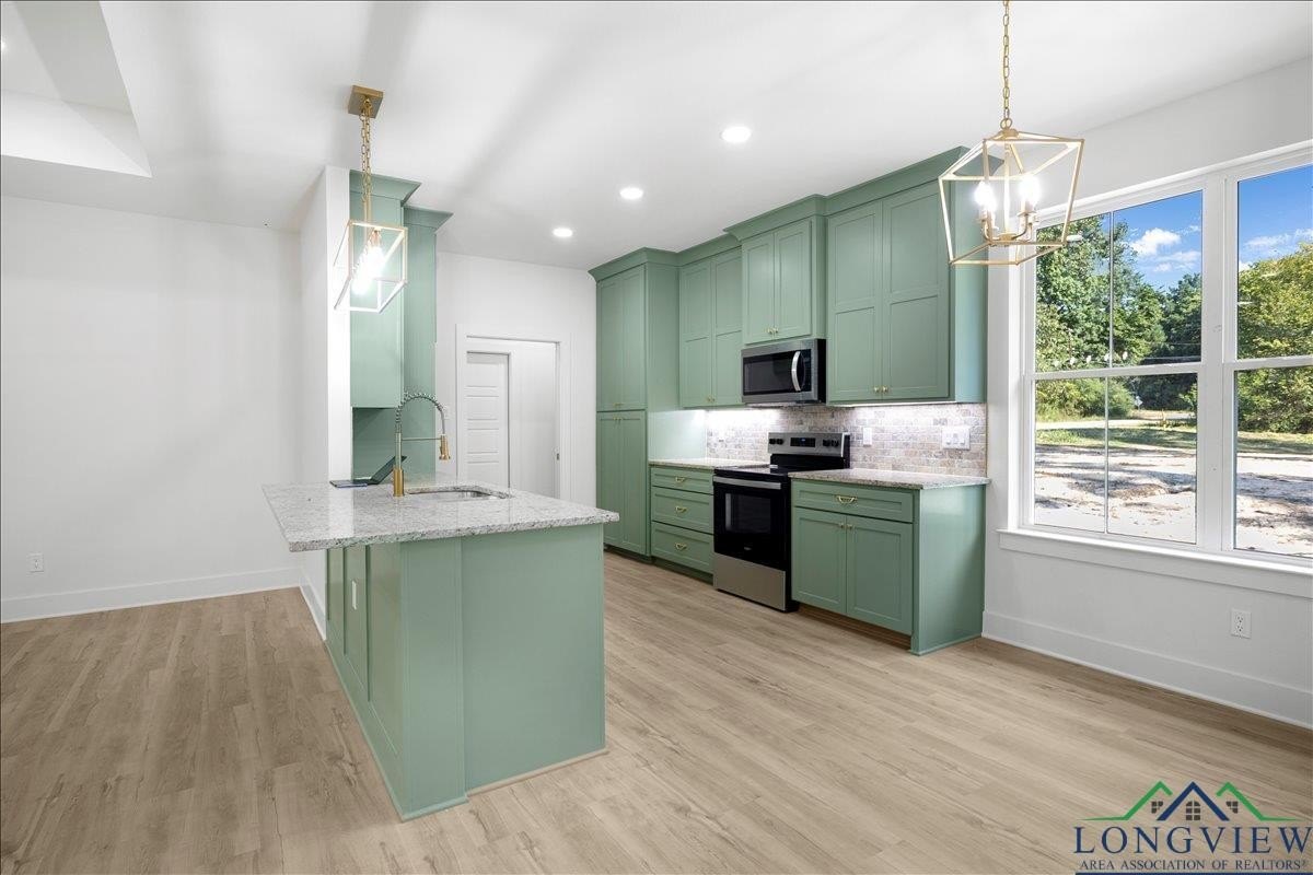 Property Description: Stunning New Construction in Hallsville ISD - Welcome to this beautiful 4-bedroom, 2-bathroom modern home located at 1674 Russell Drive in Longview, Texas. Designed with a perfect balance of luxury and everyday comfort, this home offers an inviting open floor plan with abundant natural light. A chic white and neutral color scheme, accented by sleek gold hardware and elegant finishes, creates a timeless and stylish atmosphere. The kitchen is a true showstopper, featuring granite countertops, stainless steel appliances, and custom cabinetry with a pop of unique color that adds personality and charm to the space. Durable vinyl plank flooring runs throughout the home, making it both practical and beautiful. Adding to the property’s appeal is a brand-new water well, providing an extra level of convenience and value. This home is the perfect combination of modern design, functionality, and thoughtful details. Don’t miss your opportunity to make this exquisite property your own!