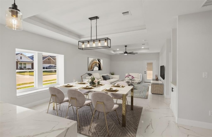 Property Description: Welcome to 1357 Beach Drive in Pelican Bay, TX – a standout new construction just minutes from Eagle Mountain Lake, built with elevated craftsmanship and above-builder-grade finishes throughout. This thoughtfully designed home features 9' walls, 10' tray ceilings in the living and dining areas, and a 12' ceiling in the foyer with chandelier. The exterior boasts full spray foam insulation (walls + attic), 30-year shingles, OSB sheathing with Tyvek wrap, and decorative brickwork. An oversized covered back patio with ceiling fan provides the perfect outdoor retreat. Inside, enjoy square tile flooring in main areas, upgraded carpet in bedrooms, modern LED square lights, and remote-controlled ceiling fans. The kitchen features quartz countertops with a waterfall peninsula, white shaker cabinetry, and a full fridge enclosure. The primary suite includes a freestanding soaking tub, marble-tiled shower with seamless glass, Carrera marble vanity, and framed mirror. All doors are solid-core shaker with modern square brushed hardware. The secondary bath also features a walk-in shower, high-end vanity, and Carrera marble top. Even the garage is finished, insulated, and includes LED lighting. No HOA. Built for long-term comfort, style, and value—don’t miss your chance to make this your next home.