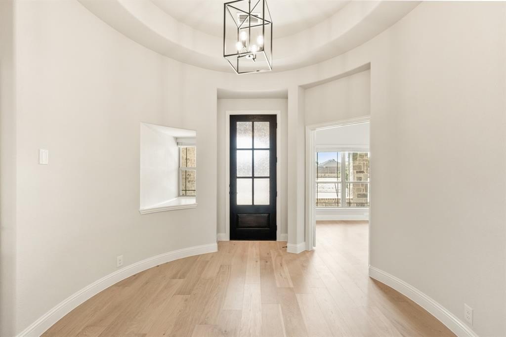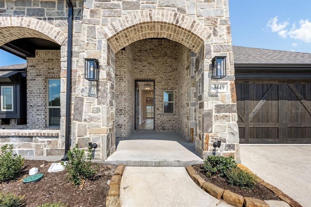 Situated on a premium lot that backs up to open farmland, this home offers rare backyard privacy, enhanced by an 8' rear fence, extended covered patio,—ideal for grilling, entertaining, or soaking up the sun. The brick-and-stone elevation features cedar garage doors, uplighting, coach lights, and full gutters, delivering unbeatable curb appeal. A Christmas light package adds a seasonal touch of convenience and charm. Step inside through the impressive 8' front door into a grand Rotunda Entry, where elegant architectural details and vaulted ceilings set the tone. Durable wood-look tile flooring flows through all main living areas, while window coverings add comfort and privacy throughout the home.