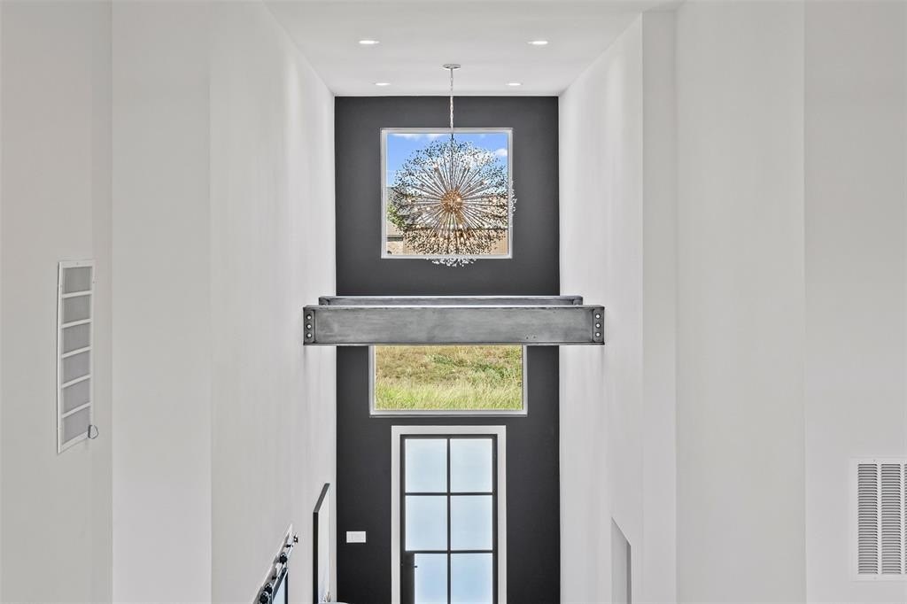 The chef’s kitchen showcases a large quartz-topped island, custom cabinetry, a butler’s closet, and premium finishes throughout. Expansive living and dining areas are framed by soaring 20-foot ceilings, custom railing details, designer wood paneling, and high-end lighting.