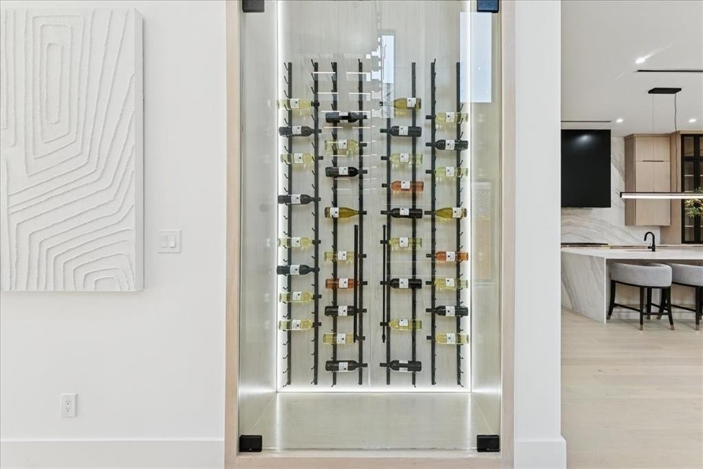 Highlights include a glass-enclosed wine display accented in oak, a wet bar connecting the media and game rooms, and spa-like bathrooms with thoughtfully curated stonework. The first-floor primary suite offers a serene retreat with a spa bath and custom rift oak cabinetry. A secondary guest bedroom is also conveniently located on the first floor, with a moody guest bath attached. Upstairs, three en-suite bedrooms are complemented by a media room, game room, and flexible space for a gym, studio, or office.