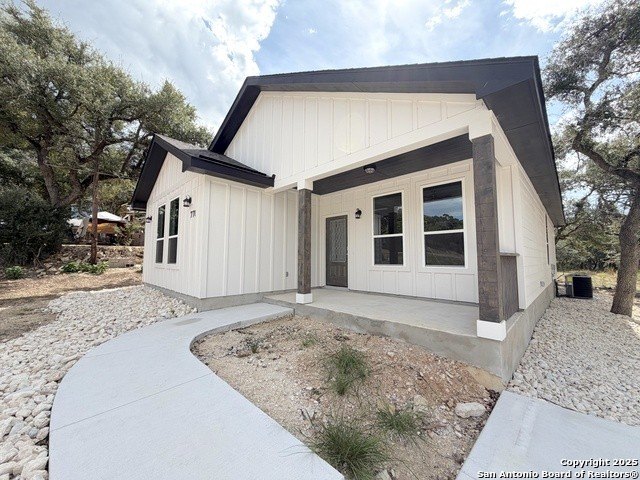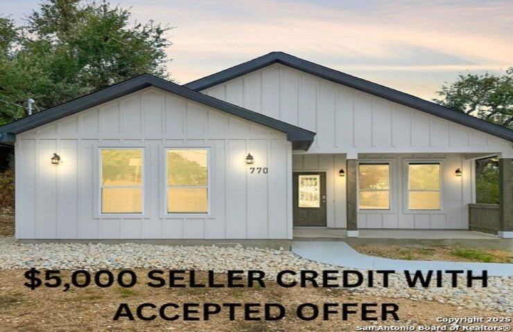 Property Description: Welcome to this new construction home in the peaceful Deer Meadows community, where Hill Country charm meets modern comfort. This beautifully designed farmhouse-style residence features a classic board-and-batten exterior, complemented by a spacious driveway with plenty of room for parking, including boat parking for lake lovers. Step inside to an inviting open floor plan filled with natural light and timeless finishes. The home is entirely tiled throughout for easy maintenance and a cohesive flow. The kitchen is a true attraction with crisp white cabinetry, granite countertops, a central island and ample counter space, perfect for both everyday living and entertaining. The primary suite is generously sized and thoughtfully designed for relaxation. The en-suite bathroom includes a double-sink vanity, a walk-in shower, and a large walk-in closet offering excellent storage space. A dedicated laundry room adds convenience and functionality to the layout. Step out the back door to your private backyard, an open canvas ready for your personal touch. Whether you envision a garden, fire pit, or outdoor kitchen, the possibilities are endless. Perfectly located near Canyon Lake's boat ramps, local dining, and the scenic Guadalupe River, this home provides the ideal balance of tranquility and accessibility to all the Hill Country has to offer. Amenities include a pool, clubhouse and playground. The HOA has minimal restrictions allowing for more flexibility. The seller is offering a $5,000 concession to the buyer with an accepted offer.