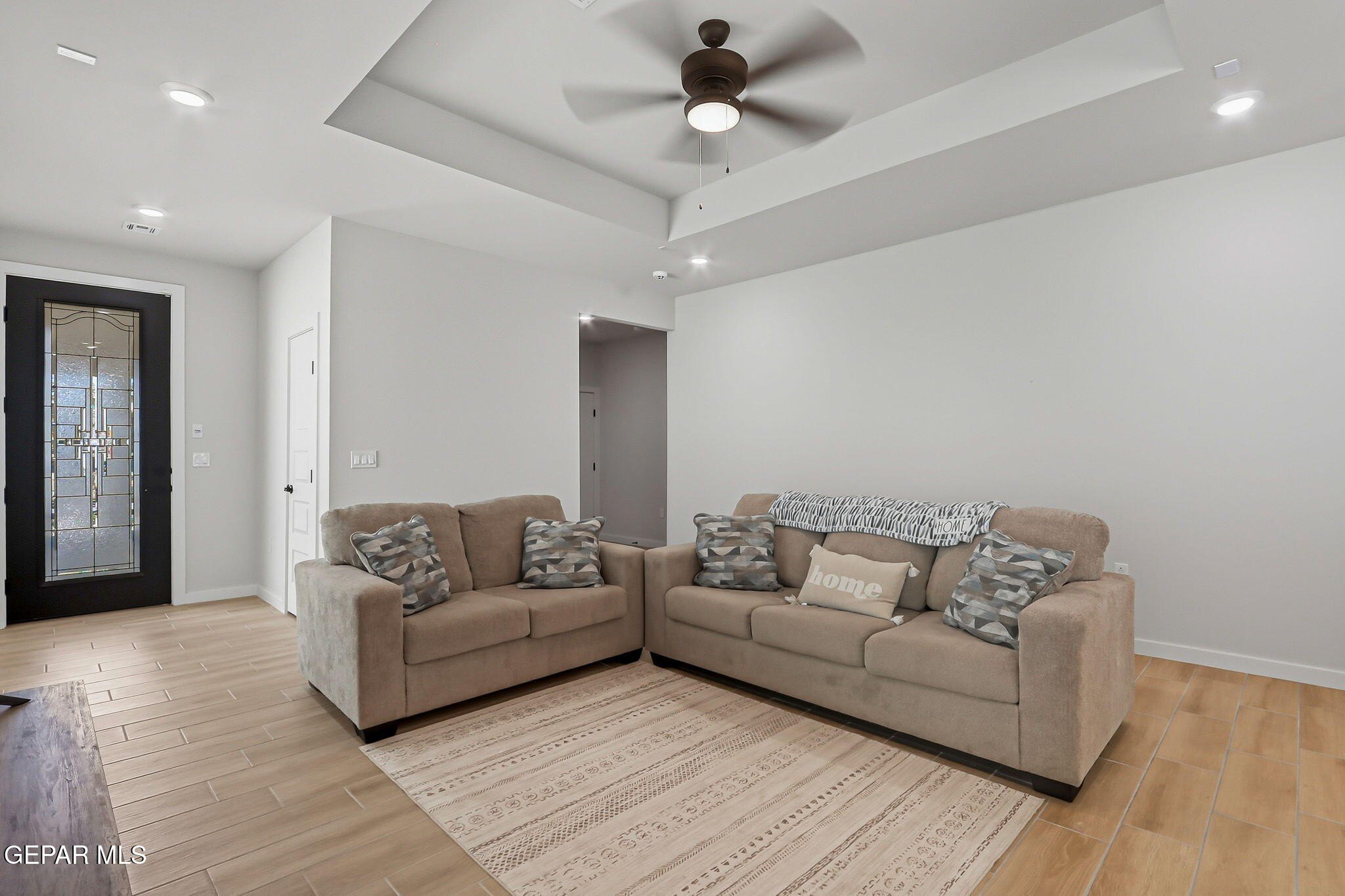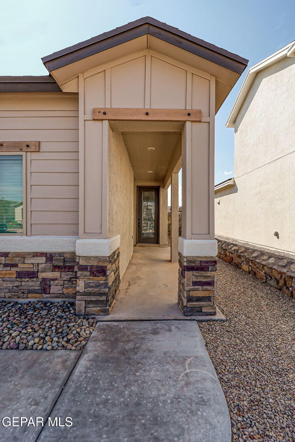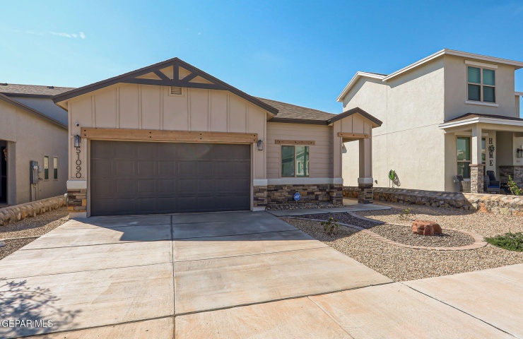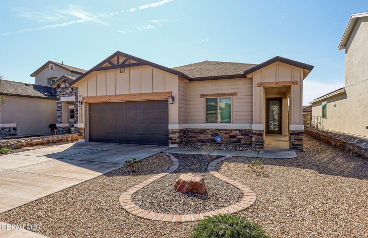Property Description: Beautiful single-story home featuring an open-concept design with high ceilings and spacious living areas. The large family/living room flows seamlessly into the kitchen and dining areas-perfect for entertaining. The kitchen offers a center island, granite countertops, stylish tile backsplash, stainless steel appliances, pantry, and cabinets with crown molding. This home includes four inviting bedrooms and two full baths. The primary suite boasts a generous walk-in closet and a luxurious bathroom. Leased solar panels help keep electric costs low year-round. Located in the desirable Campo Del Sol community, residents enjoy resort-style amenities including a lazy river, pool, parks, and scenic walking trails. With a low annual HOA and convenient proximity to schools, shopping, and Fort Bliss, this home combines comfort, value, and lifestyle in one exceptional package.