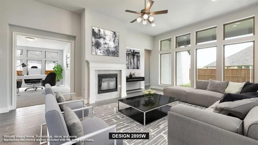 Property Description: Step off the front porch into an extended entry with soaring 12-foot ceilings. Two secondary bedrooms with walk-in closets share a Hollywood bath on one side, while the utility room sits opposite for convenience. The entryway opens into the spacious family room, anchored by a wood mantel fireplace and a wall of windows. The adjoining kitchen features an island with built-in seating, double wall oven, 5-burner gas cooktop, and ample storage, while the dining area offers direct access to the covered backyard patio. French doors lead into a game room just off the family room, perfect for entertaining. The secluded primary suite provides a private retreat, with a bath including dual vanities, a garden tub, a separate glass-enclosed shower, and two large walk-in closets. High ceilings, abundant natural light, and thoughtful storage throughout enhance this one-story design. Completing the home is a mud room and a three-car garage.