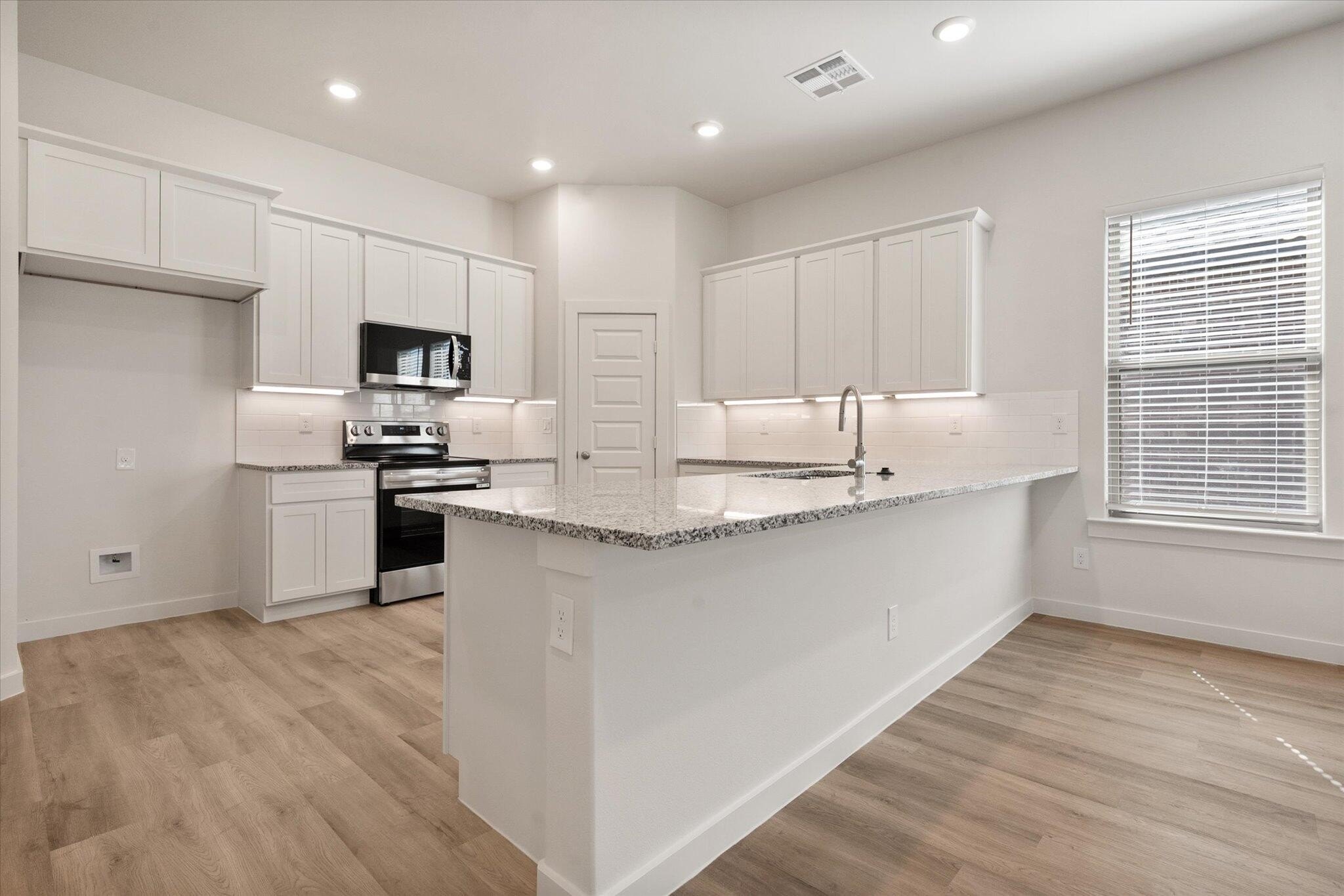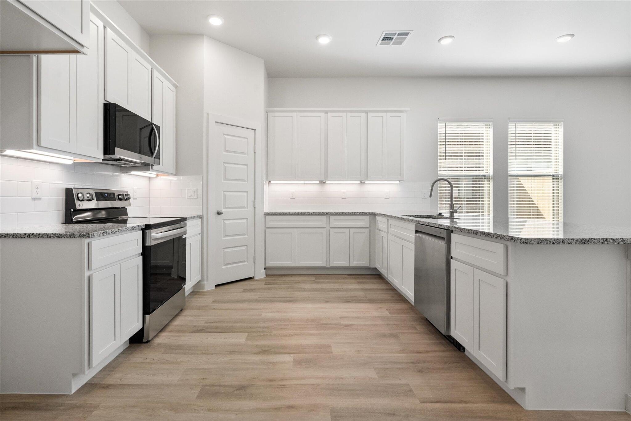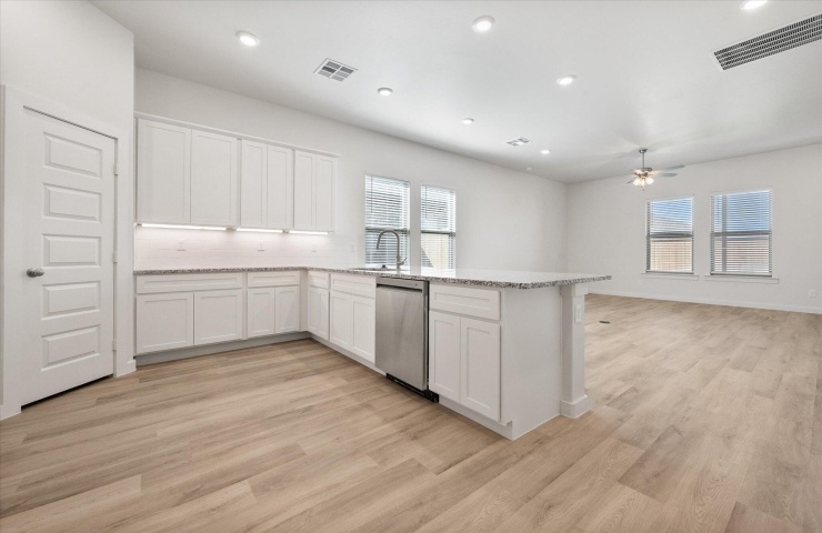 Property Description: Buy NOW and get up to $10,000 Use-It-Your-Way Cash! This beautifully designed home features a classic brick exterior and a covered front entryway, offering both curb appeal and comfort. Inside, luxury vinyl plank flooring flows seamlessly through the open-concept kitchen, living, and dining areas. The kitchen boasts granite or quartz countertops, a spacious peninsula with bar seating, stainless steel appliances, and a large enclosed pantry. Relax in the cozy living room by the corner brick fireplace, adding warmth and charm. The secluded master suite is a true retreat, featuring a drop-in tub, walk-in shower, his and hers vanities, and a walk-in closet with direct access to the utility room. A covered back patio provides a perfect outdoor space to unwind. Premium plumbing and lighting fixtures complete the home's sophisticated design.