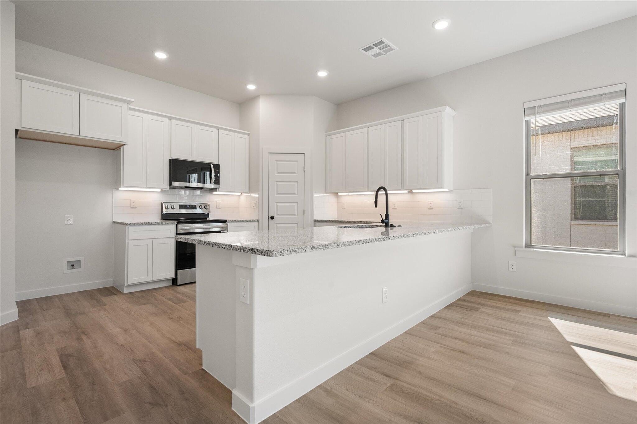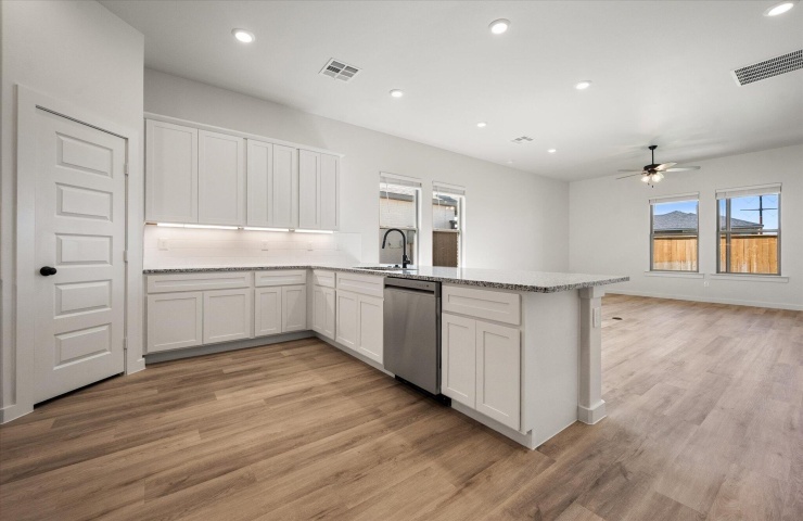 Property Description: Buy NOW and get up to $10,000 Use-It-Your-Way Cash! This beautifully designed home features a classic brick exterior and a covered front entryway, offering both curb appeal and comfort. Inside, luxury vinyl plank flooring flows seamlessly through the open-concept kitchen, living, and dining areas. The kitchen boasts granite or quartz countertops, a spacious peninsula with bar seating, stainless steel appliances, and a large enclosed pantry. Relax in the cozy living room by the corner brick fireplace, adding warmth and charm. The secluded master suite is a true retreat, featuring a drop-in tub, walk-in shower, his and hers vanities, and a walk-in closet with direct access to the utility room. A covered back patio provides a perfect outdoor space to unwind. Premium plumbing and lighting fixtures complete the home's sophisticated design.