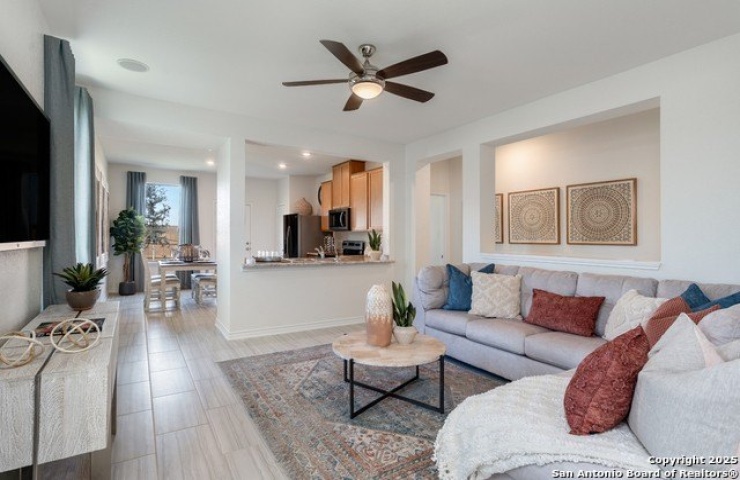 Property Description: Step into comfort and style with this beautifully designed home featuring 9-ft. ceilings on the first floor for an open, airy feel. The kitchen boasts Whirlpool stainless steel appliances, Woodmont Cody 42-in. upper cabinets, granite countertops in Barcelona, a Daltile tile backsplash, and an extended breakfast bar-perfect for casual dining. The primary bath offers a spa-like retreat with a raised vanity, upgraded cabinets, and a 42-in. garden tub/shower accented by a Daltile tile surround. Decorative touches include a Carrara-style entry door, Kwikset Polo interior hardware, 2-in. faux wood blinds, and Stella Vista ceramic tile flooring in key areas. Enjoy added peace of mind with a wireless security system and a fully sodded yard ready for outdoor enjoyment.