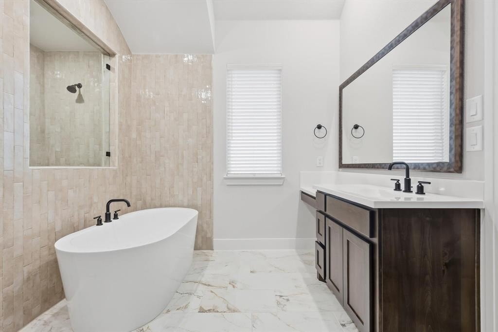 There’s a dedicated office for working from home, plus a bonus media or game room that gives everyone a space to relax or play. Guests will love their own private suite with a full bath, while two additional secondary bedrooms share a convenient Jack-and-Jill layout. The primary suite is tucked privately at the rear of the home and offers a spa-like retreat complete with a slipper tub, a stunning walk-in shower, and generous closet space.