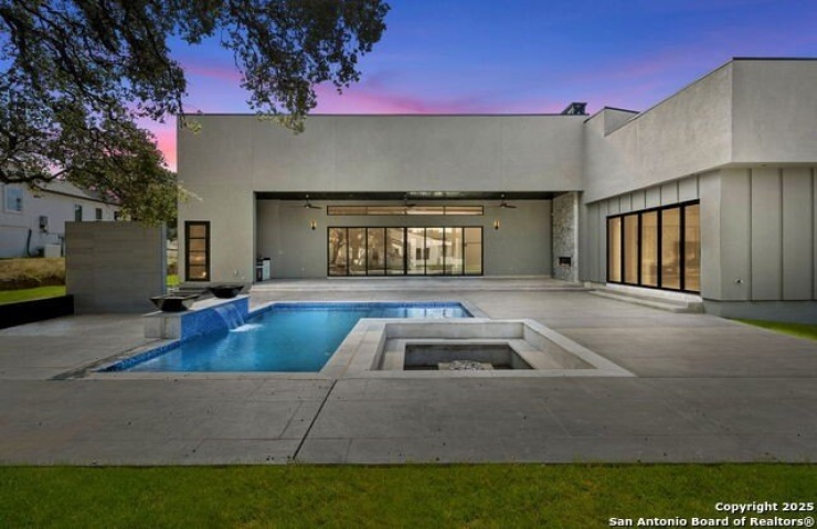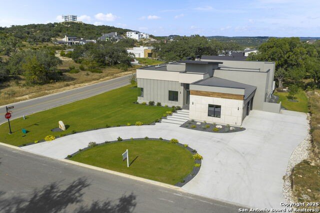 Property Description: A statement of modern architecture and refined Hill Country living, this custom single-story residence in The Canyons at Scenic Loop is constructed with 2x6 exterior framing, enhanced insulation, and single-slope standing seam metal roofing for superior efficiency, longevity, and clean contemporary lines. Offering 3,719 sq. ft. of intentional design, the home features gallery-height ceilings, expansive walls of glass, and seamless indoor-outdoor connection. The open living space is anchored by a striking feature wall with a linear fireplace, flowing into a chef's kitchen with European-inspired cabinetry, a waterfall black granite island, 48" professional gas range with pot-filler, double ovens, and a hidden walk-in pantry. The owner's retreat evokes a spa-like sanctuary with a sculptural soaking tub, oversized glass shower, and warm natural textures. Outdoor living becomes an everyday experience with a resort-style pool and elevated spa framed by water and fire features, covered lounge terrace with fireplace, outdoor kitchen, and poolside shower beneath heritage oaks-where minimalist design and luxury craftsmanship meet at the highest level.