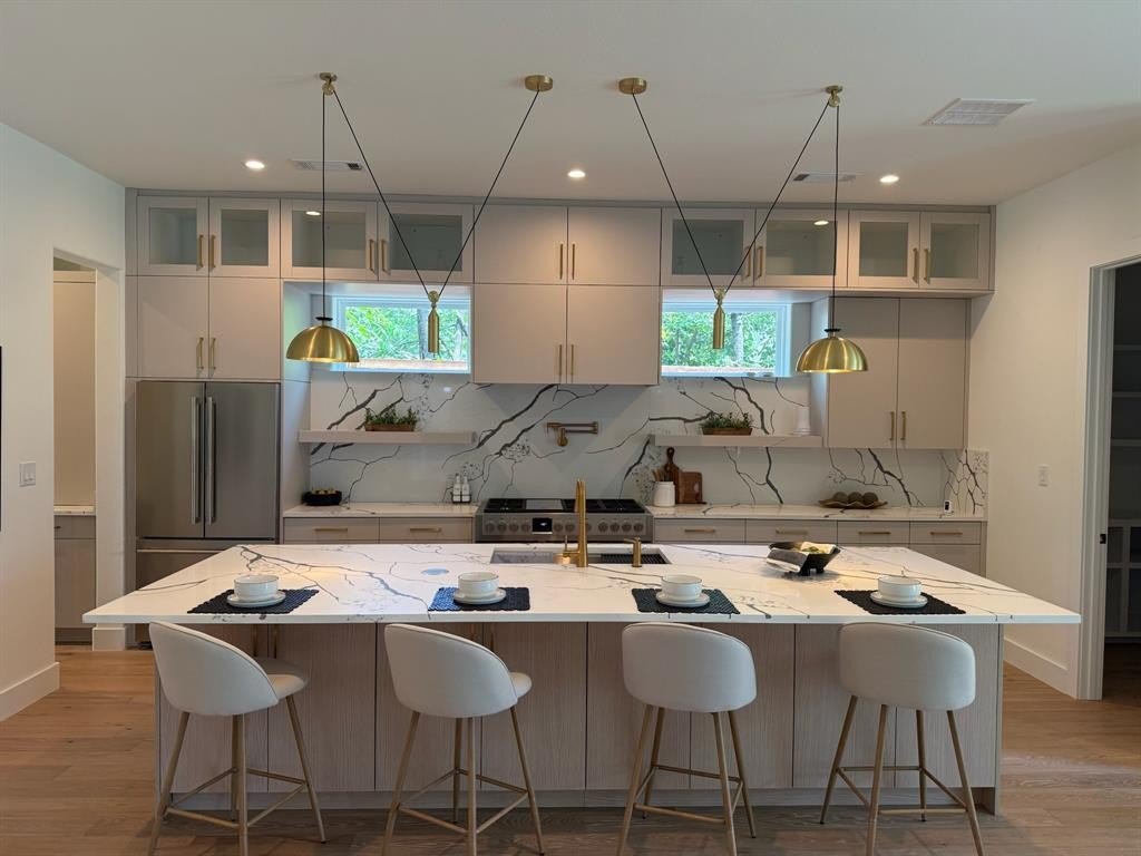 An expansive open-concept living area with soaring ceilings and designer lighting highlights every detail. At the heart of the home, the chef’s kitchen impresses with professional-grade appliances, quartz countertops, a generous island, custom cabinetry, butler’s pantry, and walk-in pantry. A light-filled home office offers versatility for work or study.