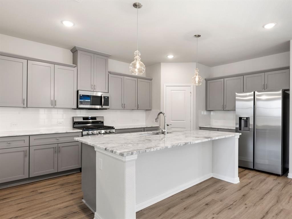 Property Description: RISLAND HOMES 3206-C home design. DON'T MISS THIS UNIQUE OPPORTUNITY! Discover this beautiful 4-bedroom, 4.5-bath home with 2-car garage and 2,676 sqft of modern living space. Both the primary suite and the 2nd bedroom are located downstairs, each with its own ensuite bathroom—perfect for a mother-in-law suite. Situated across from the Bluebonnet Community Garden, this home offers scenic views and access to resort-style community amenities, including a pool, splash pad, playground, hiking and biking trails, pickleball courts, and a dog park. Featuring a stylish stone exterior, chrome fixtures, and a spacious backyard with a full sprinkler system and covered rear patio, this home is perfect for outdoor living.