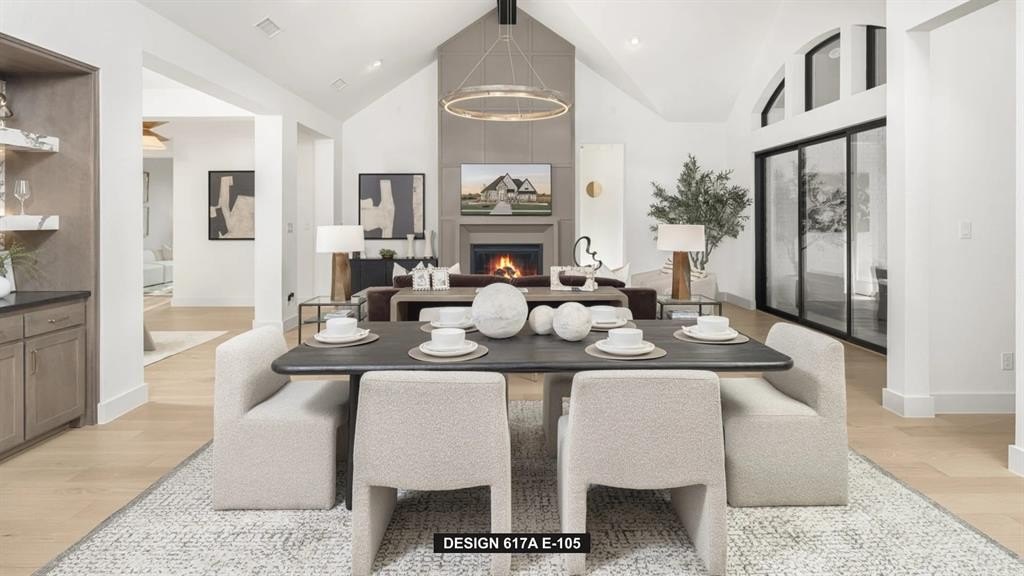 Property Description: Home office with French doors set at entry. Formal dining room and game room with French doors frame extended entry. Family room with a decorative beamed ceiling, sliding glass door and fireplace opens to morning area and kitchen. Kitchen hosts elongated island with built-in seating space. Primary suite includes bedroom with wall of windows. Dual vanities, freestanding tub, separate glass-enclosed shower and large walk-in closet in primary bath. All secondary bedrooms feature private baths. Soaring ceilings and large windows add to this generous four-bedroom design. Extended covered backyard patio. Mud room leads to three-car garage.