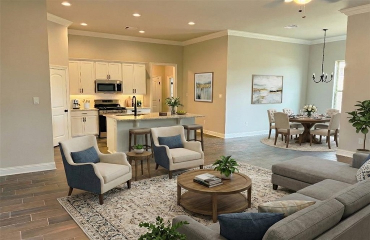 The ROSES V A in Cane's Landing community offers a 3 bedroom, 2 full bathroom, open and split design with a flex space, a separate dining area, and a computer niche with a built-in desk.
