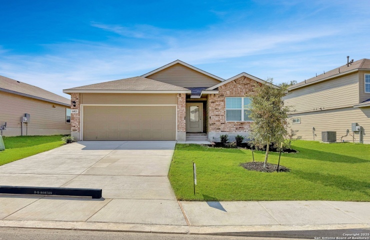 Property Description: Introducing The Torre, a one-story home featured in our Riverstone at Westpointe community in San Antonio, TX. This floor plan offers 3 classic exteriors, 2-car garage, and a full yard landscaping and irrigation package, ensuring that your home looks its best every single day. Inside this 3 bedroom, 2 bathroom home, you'll find 1442 square feet of open-concept living. A front foyer leads you to a blended dining area, gourmet kitchen, and living room, perfect for entertaining and every day living. Your kitchen includes quartz countertops, stainless steel appliances, gas cooking range, stylish subway tile backsplash and abundant cabinet storage space. The private main bedroom is located off the living room towards the back of the home and includes a connected ensuite bathroom with dual vanity sink, a garden bathtub and a spacious tiled walk in shower. Enjoy additional privacy with a separate door for the toilet and a walk-in closet with built in shelving. Your secondary bedrooms are located at the front of the home right off the foyer and all feature quality carpet flooring and a closet, and can be used as bedrooms, offices, workout spaces or other bonus rooms. The possibilities are endless with The Torre floor plan. Additional features include tall 9-foot ceilings, 2-inch faux wood blinds throughout the home, luxury vinyl plank flooring at entry, living room, kitchen, and dining area, ceramic tile in the bathrooms and utility room, and pre-plumb for water softener loop. You'll enjoy added security in your new home with our Home is Connected feature. Using one central hub that talks to all the devices in your home, you can control the lights, thermostat and locks, all from your cellular device. Relax outside on the covered patio (per plan) and enjoy full yard landscaping and full yard irrigation. This perfect starter home includes our HOME IS CONNECTED base package. Using one central hub that talks to all the devices in your home, you can control the lights, thermostat, locks and more all from your cellular device.