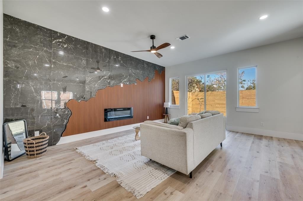 Experience elevated living in this stunning 4-bedroom, 3.5-bath new construction, crafted with sleek architecture and high-end designer finishes. The open-concept layout features a showpiece kitchen with a waterfall island, custom cabinetry, and premium appliances, flowing seamlessly into a sophisticated living area highlighted by a dramatic stone accent wall and modern fireplace.