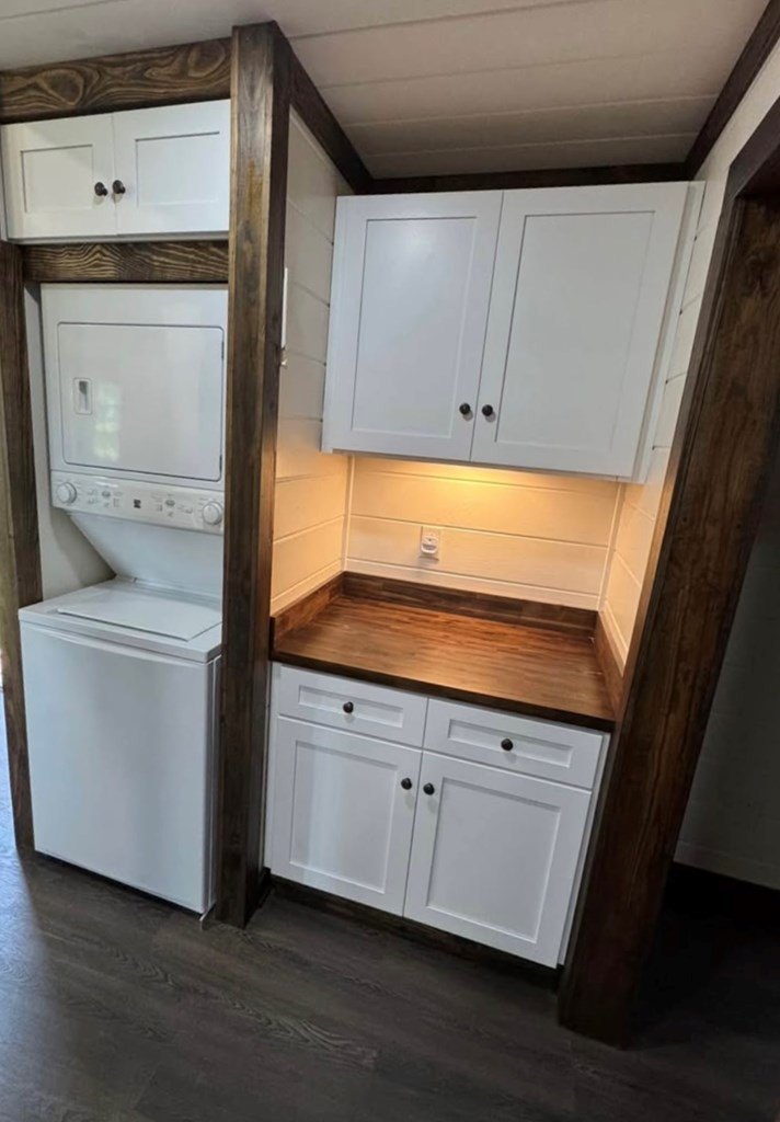 Property Description: New Tiny Home, 16 x 32, Metal Siding & Roof, Very Well Built, New appliances which includes, stove, built in microwave, stackable washer & dryer, 50 yr. Flooring from Russell's Floors one by eight tongue & groove, full kitchen, living room has 10 foot ceilings, tankless water heater with water filter, remote control ceiling fans with 18,000 BTU heat & cool mini split.