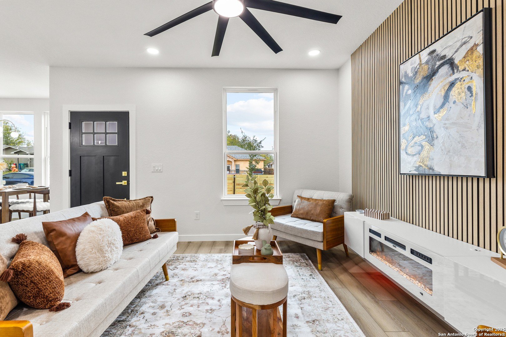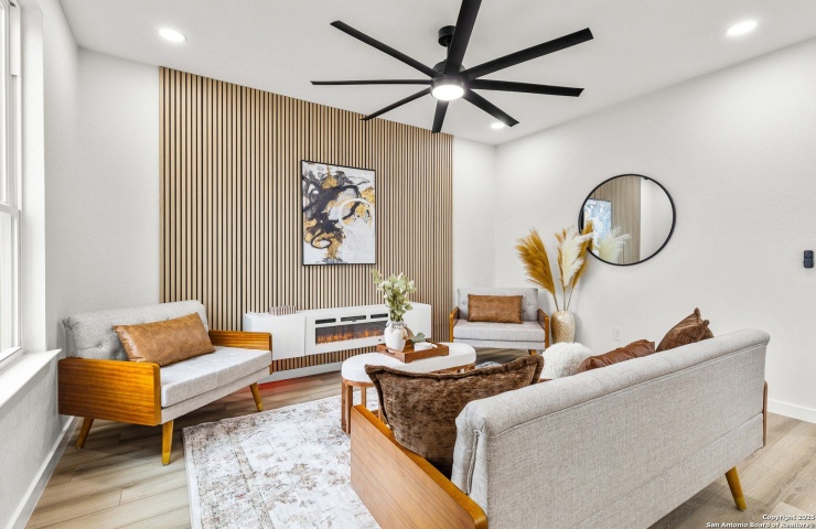Property Description: Welcome to 135 Sligo. Stunning new-construction home with NO HOA, thoughtfully designed for modern living. This 3-bedroom, 2-bath residence offers approximately 1,300 sq ft of open-concept space filled with natural light and upscale finishes throughout. The spacious living area features luxury vinyl plank flooring, a striking accent wall with an electric fireplace, and seamless flow into the kitchen, perfect for both everyday living and entertaining. The kitchen shines with soft-close solid wood cabinetry, sleek quartz countertops, stainless steel appliances, and a large center island ideal for gatherings. The private primary suite includes a beautifully appointed bathroom with quartz countertops, modern fixtures, and designer tile work. Secondary bedrooms are well-sized and versatile for guests, home office, or family needs. Additional highlights include recessed lighting, contemporary finishes throughout, energy-efficient construction, and a low-maintenance lifestyle-all without HOA restrictions. Conveniently located on the Southside of San Antonio with easy access to major roads, shopping, dining, and downtown.