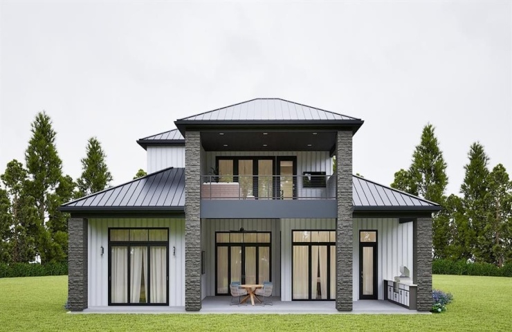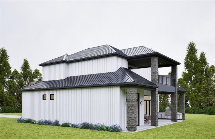 The striking exterior showcases a standing-seam metal roof, stone accents, and contemporary siding, creating exceptional curb appeal. Inside, the open-concept floor plan is filled with natural light and features wide-plank flooring, soaring ceilings, and expansive black-framed windows that seamlessly connect indoor and outdoor living.