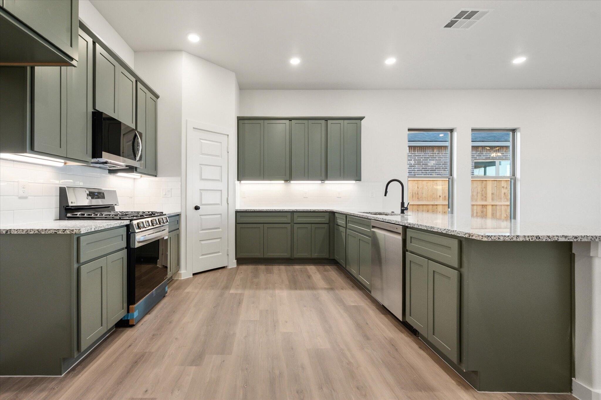 Property Description: Buy NOW and get up to $10,000 USE-IT-YOUR-WAY CASH! This beautiful home features a brick exterior with double columns and stone accents framing the covered front porch. Inside, luxury vinyl plank flooring flows through the open-concept kitchen, living, and dining areas. The kitchen includes granite or quartz countertops, a spacious peninsula with bar seating, stainless steel appliances, and a large enclosed pantry. The cozy living room boasts a corner brick fireplace. The secluded master suite offers a drop-in tub, walk-in shower, his and hers vanities, and a walk-in closet with utility room access. Enjoy the outdoors on the covered back patio. Premium fixtures complete this elegant home.