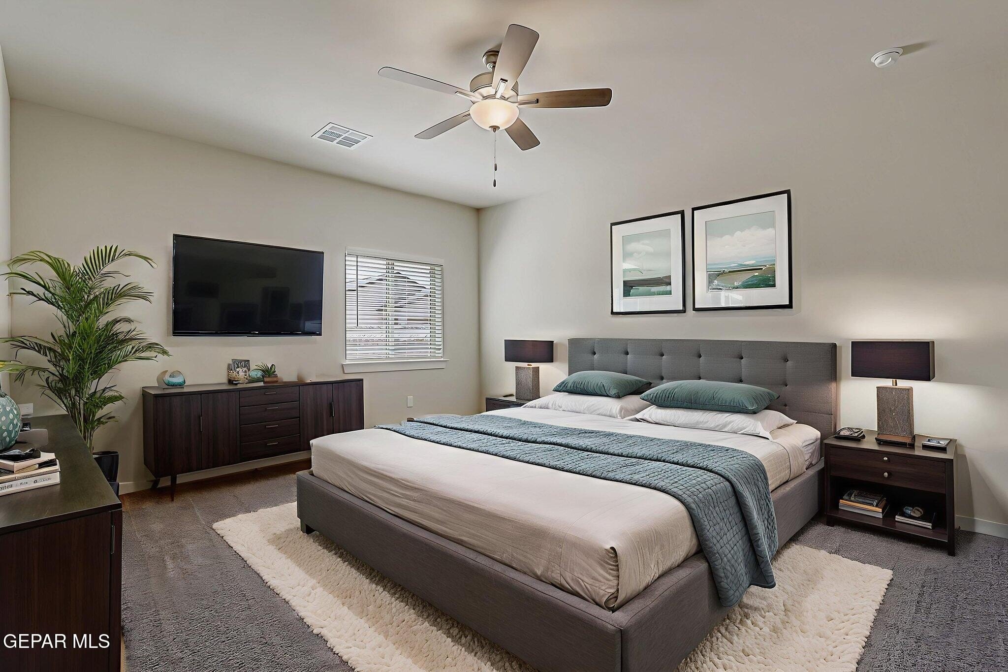 Property Description: **Ask about our builder incentives!** The Oregon, a great single-story new contruction home. The Large Living room opens to kitchen and dining areas making it an Open concept plan. High ceilings in living area. Beautiful Kitchen with island, granite countertops and tile backsplash, rangehood, cooktop, wall microwave and cooktop and dishwasher all stainless steel appliances, pantry and wood cabinets with crown molding and hardware. Three wonderful bedrooms with two baths. The Primary bedroom zone separate with arge walk-in closet, bathroom with large shower, double vanities, and floating cabinets. Ceramic tile flooring in all living and wet areas, carpet in bedrooms. 8 foot entry door, double pane window with faux wood blind window treatments on major windows. All this plus central refrigerated A/C Pictures are for propose plan and not of actual home. 3D Tour is for demonstration purposes only. Please visit our Campo del Sol model home at 11126 Ground Cherry El Paso, TX, 79934. Open Daily 11am-6pm