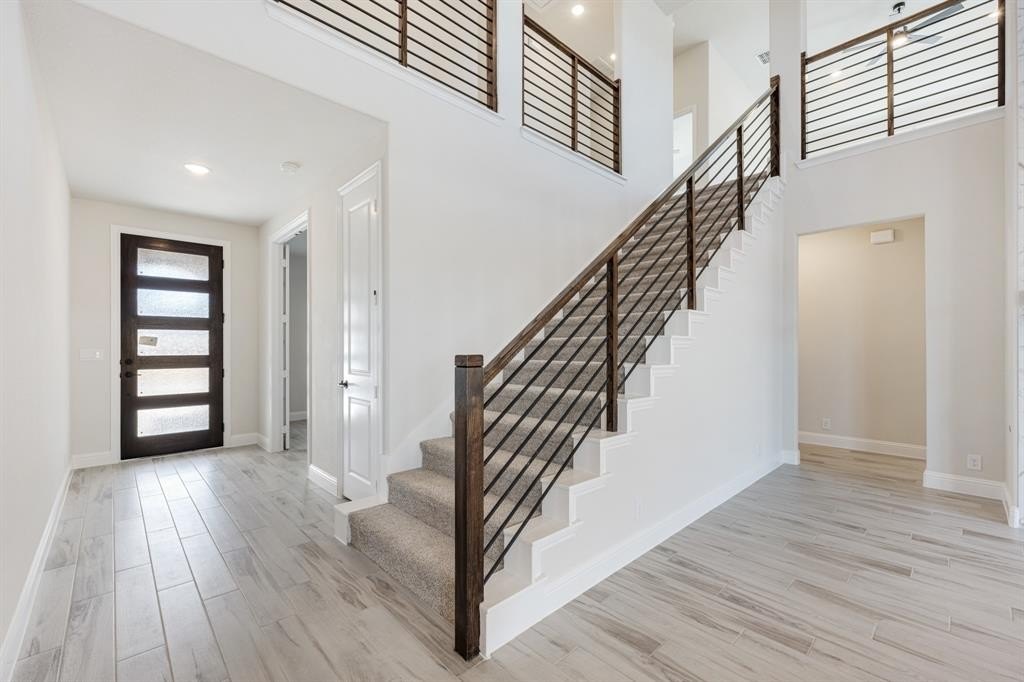 Property Description: NEW! NEVER LIVED IN & QUICK CLOSE READY. Volume, light and flexibility define the Bloomfield Homes Seaberry plan, holding 4 bedrooms, 4 baths, dual garages, and a contemporary open layout. Premium corner homesite at the end of a cul-de-sac in a quiet part of Devonshire, with the trail system passing by just across the street! Finished with a brick and stone facade, stained wood garage doors on the swing entry 2-car garage and separate front-facing mini garage, an 8' front door, uplights, gutters, and polished landscaping. The home feels bright and airy thanks to a soaring two-story ceiling and a modern tile fireplace in the family room, 8' interior doors throughout the first floor, and tons of windows! A Deluxe Kitchen is lined with Driftwood Shaker-style maple cabinetry and Calacatta Extreme quartz countertops, as well as upgrades like pot and pan drawers, built-in appliances, a wood vent hood, pendent lighting, and a pot filler! Great storage is found not only from cabinets, but also a huge walk-in pantry and a handy Butler's pantry. Wood-look tile runs throughout the first floor, while a dedicated media room and a reconfigured Bedroom 6 (or flex as a study) with a shower in lieu of a tub add versatility that adapts to changing needs. The primary suite is also located on the first floor, privately positioned and finished with quartz countertops, a generous L-shaped vanity, and another roomy closet. A spacious game room upstairs overlooks the family room below, surrounded by secondary bedrooms and baths finished in coordinated tile and quartz selections - including a Jack-and-Jill arrangement! Practical upgrades including upper cabinets added to the laundry room, blinds, and a covered patio with ceiling fan are already in place. Devonshire offers a clubhouse, 2 resort-style pools, playgrounds, trails, and green spaces—visit the Bloomfield Homes model in Devonshire to experience this Seaberry firsthand!