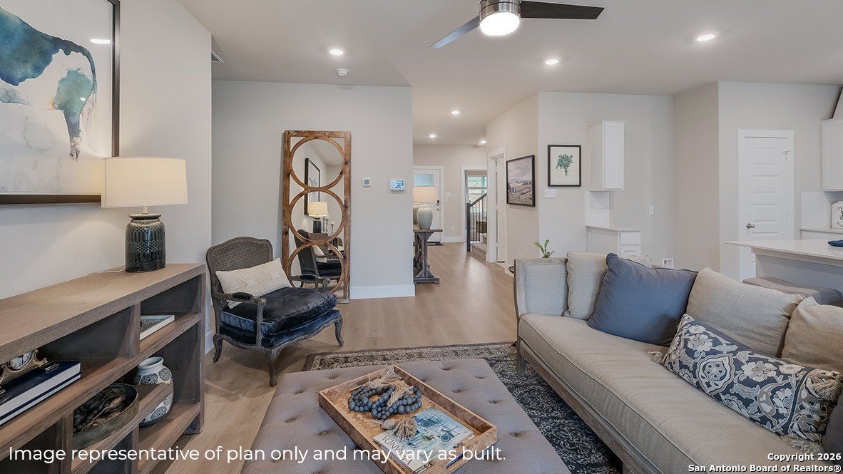 Property Description: Welcome to The Naples, a gorgeous two-story home located at Brookstone Creek in San Antonio, TX. This floor plan offers 2 classic exteriors and a spacious 2-car garage. An inviting front porch welcomes you inside this 4 bedroom, 3 bathrom home situated across 2293 sq. ft. of living space. Follow the foyer down to an open concept living room, dining nook and kitchen with a spacious corner pantry. Your gourmet kitchen also includes stainless steel appliances, a natural gas cooking range, easy-mainentance quartz countertops and an eat-in kitchen island overlooking the living room. A deep, single basin sink located at the kitchen island makes washing dishes a breeze! A covered back patio (per plan) is located toward the back of the home off the dining area. Take a load off and relax with your loved ones in a fully landscaping and irrigated back yard with Bermuda sod. The primary bedroom is located downstairs off the living room and offers quality carpet flooring, large windows, a ceiling fan and a spacious ensuite bathroom. You'll enjoy dual vanity sinks, stylish shaker cabinetry and a large walk-in closet with tile surround. Your toilet is located through a separate doorway, ensuiring maximum privacy. The primary bedroom walk-in closet is a standout of this floor plan with plenty of storage space. Upstairs you will find an open loft or game room space, perfect for lounging, a third full bathroom and two additional secondary bedrooms. These rooms are versatile and can be set up as offices, home gyms or other spaces. All come complete with carpet flooring and closets. Additional features of The Naples include hard surface flooring at the entry, downstairs, halls, living room, kitchen, and dining/breakfast area, ceramic tile in all bathrooms and utility room, pre-plumb for water softener loop, and faux wood window blinds. Finally, this home includes our HOME IS CONNECTED base package. Using one central hub that talks to all the devices in your home, you can control the lights, thermostat and locks, all from your cellular device.