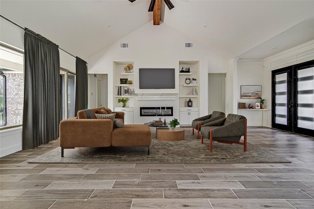 The gourmet kitchen is a true showstopper with abundant cabinetry, a striking waterfall backsplash behind the stove, built-in microwave, and a built-in ice maker—perfect for warm Texas days. A massive walk-in pantry with plentiful shelving ensures you’ll never run out of storage space. The dining area overlooks the backyard through oversized windows, making every meal a moment to enjoy the view.