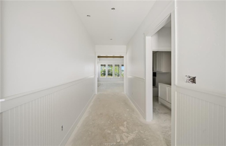 Tucked quietly off the laundry room and garage entry hall, the pocket office offers a private, purposeful workspace that feels integrated without being on display. A trim-lined hallway leading to the secondary bedrooms adds subtle craftsmanship and visual interest.