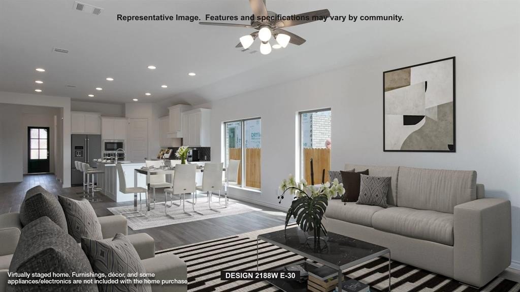 Property Description: Extended entry with 12-foot ceiling leads to open kitchen, dining area and family room with 10-foot ceilings throughout. Kitchen features corner walk-in pantry, a 5-burner gas cooktop, and generous island with built-in seating space. Family room features wall of windows. Primary suite with 10-foot ceiling and wall of windows. Dual vanities, garden tub, separate glass-enclosed shower and large walk-in closet in primary bath. A Hollywood bathroom connects to bedrooms three and four. All bedrooms feature walk-in closets. Covered backyard patio. Mud room off two-car garage.