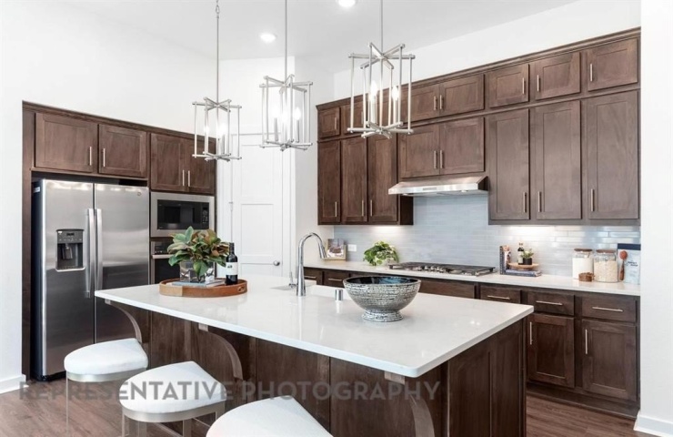 Bay window at Primary Suite, Extended Outdoor living, Fireplace, Freestanding Tub, 8 Foot Interior Doors and Stained Island