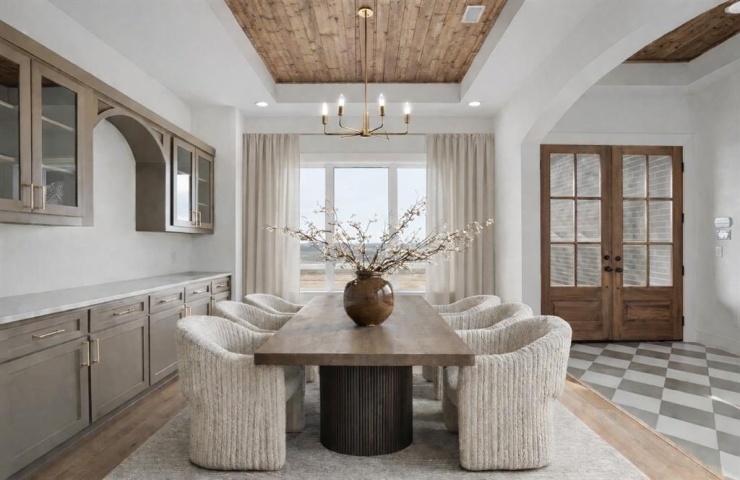 A dedicated office with accent walls adds both character and functionality. The primary suite offers tray ceilings and a private sitting area, while the spa-inspired primary bathroom features dual showerheads with rainfall fixtures, custom cabinetry, a striking black soaking tub, and a custom walk-in closet.