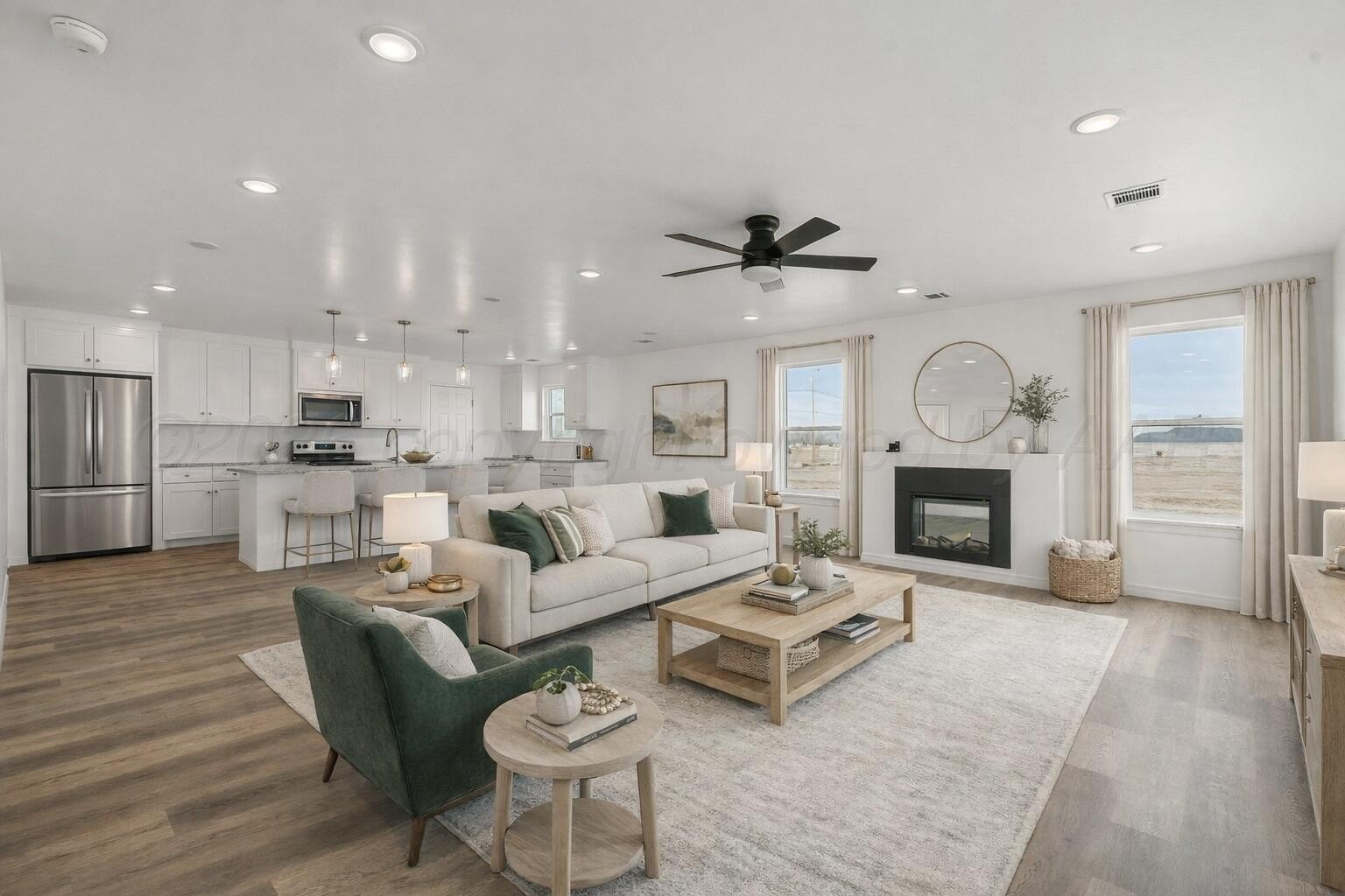 Property Description: 3/2/2 with clean lines, contemporary feel, and an open concept in this inaugural build by Sloan Construction. The living area is built for everyday comfort and connection, anchored by an electric fireplace and seamless flow into the kitchen that has ample counter space and a MASSIVE pantry! There is a sweet office space or sitting area that leads into the isolated primary suite which has great natural light! The en-suite features a walk-in shower, separate tub and FANTASTIC closet space. Secondary bedrooms are generously sized, and also have LARGE closets. Functionality continues from the garage into the home with built-in organization for bags and shoes. The home's overall design emphasizes organization, functionality, light, and simplicity!