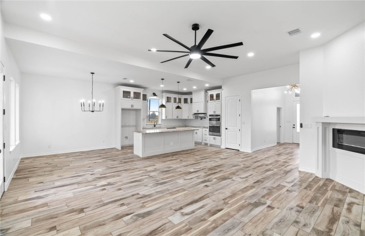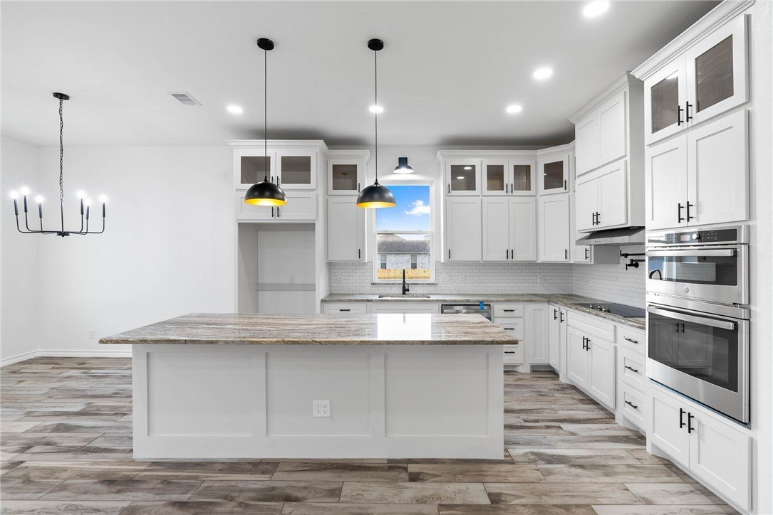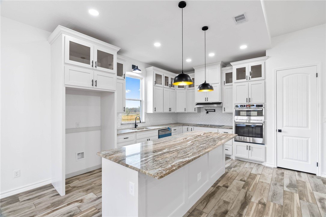 Property Description: Beautiful new-construction home offering 4 bedrooms, 3 full baths, and approximately 2,048 sq. ft. of thoughtfully designed living space. The striking exterior showcases a modern blend of white stucco, black trim accents, warm taupe wood detailing, ledger stone, and multi-tone brick for impressive curb appeal. Inside, the open-concept layout features high ceilings, rich wood-look tile flooring, an electric fireplace, and abundant natural light. The spacious kitchen is designed for both everyday living and entertaining, complete with a large flat-top island bar, granite countertops, built-in microwave, stainless built-in oven, designer pendant lighting, subway tile backsplash, and extensive custom cabinetry including glass upper cabinets for added display and storage. A wall-mounted pot filler above the cooktop enhances the chef-inspired design, offering added convenience and a luxury detail you will appreciate. The private owner's suite offers vaulted ceilings and a spa-inspired bath featuring dual vanities, framed mirrors with upgraded lighting, and a beautifully tiled walk-in shower with modern matte black fixtures and a rain-style showerhead. The oversized walk-in closet is thoughtfully designed with built-in shelving, drawers, and hanging space for optimal organization. Additional features include energy-efficient construction, generous storage throughout, and a covered rear patio overlooking the backyard-ideal for relaxing or entertaining. From striking finishes to functional design, this home offers the perfect balance of a modern lifestyle and comfort.