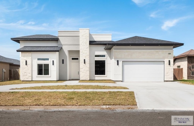 Property Description: New construction by Aladino Homes located in the established Windcrest Subdivision. This move-in ready custom 4-bedroom, 3-bath home offers 2,200 living sqft designed with comfort and efficiency in mind. Features include high ceilings, commercial ceiling fans, abundant natural light, and wood-look tile flooring throughout. Black fixtures and hardware add a clean, modern contrast. The kitchen features quartz countertops, a walk-in pantry, and an open layout flowing into the living and dining areas. The primary suite includes a spacious walk-in closet and tiled shower niches. Two secondary bedrooms share a convenient Jack-and-Jill bathroom. Additional highlights include an integrated security system, 8-ft garage doors, and a spacious laundry room. The exterior blends clean stucco with stone accents and modern lighting, creating timeless curb appeal. Conveniently located with easy access to South Padre Island and SpaceX.