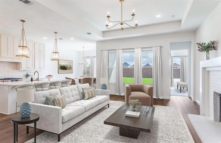 The spacious family room offers a warm, inviting atmosphere with designer lighting and a statement fireplace, while large picture windows frame tranquil outdoor views. The primary suite is a private retreat complete with spa-inspired bath, oversized walk-in shower, freestanding soaking tub, and generous closet space with built-in organization.