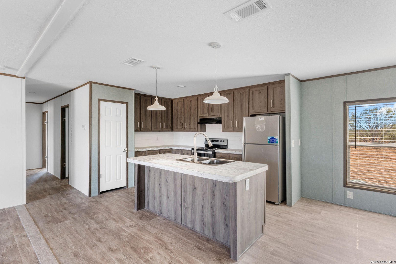 Property Description: This brand-new open concept double-wide manufactured home offers 4 spacious bedrooms and sits on 1.38 acres of unrestricted land with beautiful bluff views and wide-open skies. Enjoy the perfect blend of modern comfort and rural charm. Step inside to a bright, airy layout designed for both everyday living and entertaining. The open living, dining, and kitchen areas create a seamless flow, featuring all-new finishes, modern fixtures, and abundant natural light. The split-bedroom design provides privacy, while the primary suite offers a relaxing retreat with a spacious bath and generous closet space. Everything is brand new and comes with warranties for added peace of mind. With 1.38 acres of unrestricted land, you have the freedom to bring your animals, add a workshop, park your RV, or simply enjoy the space and privacy. If you've been looking for a move-in ready home with land, views, and no HOA restrictions - this is it. Schedule your showing today and come experience the quiet beauty of Atascosa County living!
