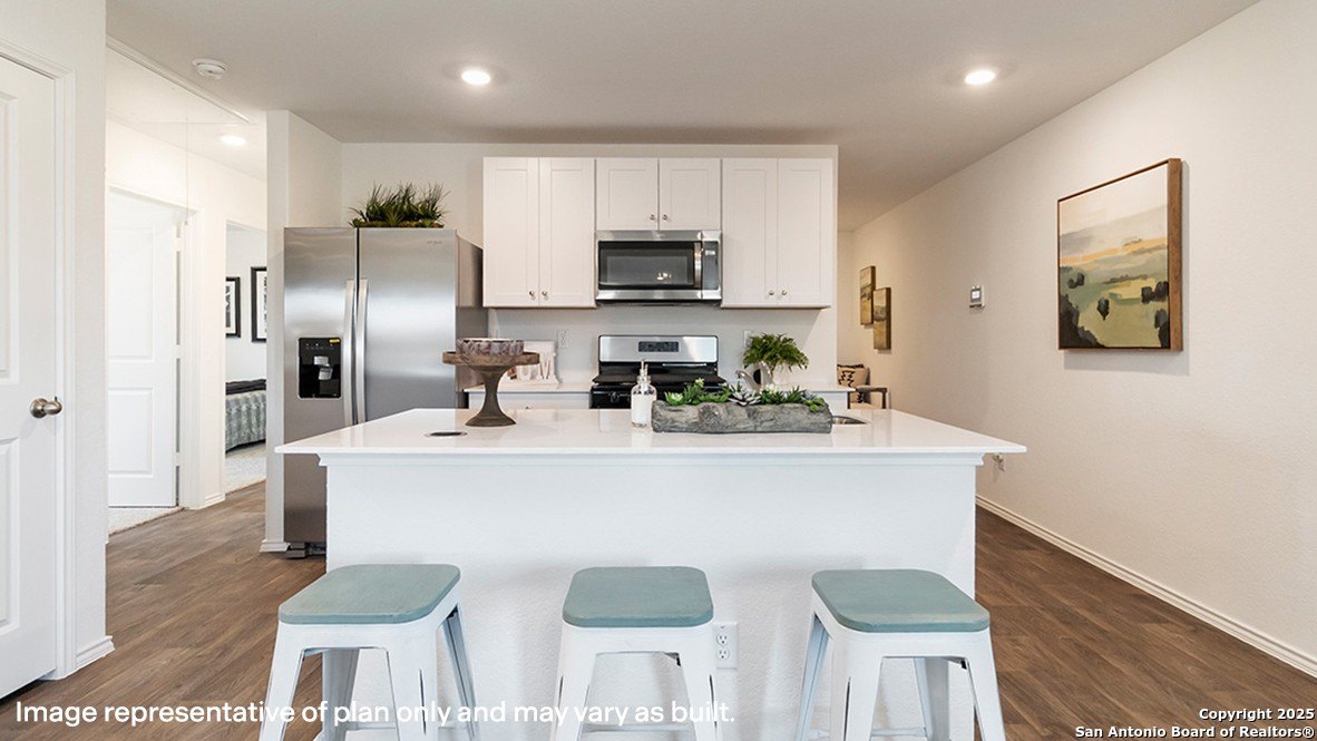 Property Description: The Estero is a charming one-story home featured in Hickory Ridge in Elmendorf, TX. Featuring 2 classic front exteriors, this 4 bedroom, 2 bathroom home also offers 1586 square feet of living space and a 2-car garage. A front porch (per plan) welcomes you into the home and opens to the gourmet kitchen which includes quartz counter tops, shaker style cabinets, stainless steel appliances and an open concept floorplan with the kitchen flowing seamlessly into the dining room and living room. The main bedroom has an attractive ensuite bathroom that features a quartz vanity countertop, shaker style cabinetry and a spacious tiled walk-in shower. Enjoy additional storage with a large walk-in closet in the primary bedroom. Your secondary bedrooms all feature quality carpet flooring and a closet, and can be used as bedrooms, offices, work out spaces or other bonus rooms. The possibilities are endless with The Estero floor plan. Additional features include sheet vinyl flooring in entry, living room, and all wet areas, quartz counter tops in all bathrooms and HOME IS CONNECTED base package. Using one central hub that talks to all the devices in your home, you can control the lights, thermostat and locks, all from your cellular device.