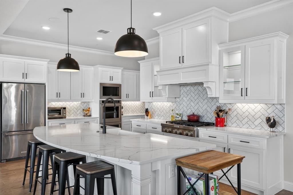 Property Description: Welcome to your stunning custom-built home in the highly sought-after Walsh Ranch within Aledo ISD. Perfectly positioned on a premium lot with ample space for a future pool, this property offers breathtaking views of the greenbelt and Lake Park. Enjoy these serene surroundings from the covered patio featuring an outdoor gas fireplace, or from the oversized upstairs decks which is one of the only in the neighborhood—ideal for entertaining or relaxing evenings. As you step inside, you’re greeted by a grand entry with soaring 20+ foot ceilings that immediately set the tone for the home’s elegance. The gourmet kitchen is a chef’s dream, complete with a large center island, farmhouse sink, top-tier appliances, a built-in nugget ice maker, and a spacious walk-in pantry. The adjacent living room boasts vaulted ceilings, custom built-ins, a convenient gas fireplace, and a multi-panel glass slider opening seamlessly to the backyard. The first-floor owner’s retreat offers a spa-inspired bath with four shower sprays, a soaking tub, a large walk-in closet, and a built-in coffee bar. A private guest suite with its own bath and exterior entrance is also located on the main level. Additional downstairs features include a dedicated home office with hidden storage, a stylish wine bar, and a media room with a mounted projector and surround sound. Upstairs, three bedrooms each include their own bathrooms, along with a game room featuring a wet bar and access to the oversized deck. The three-car garage includes epoxy floors, tankless water heaters, EV charging, and room for extra workspace. Thoughtful upgrades, abundant natural light from the many windows and recessed light throughout, and luxury finishes make this home truly one of a kind—move in today. Listing agent is one of the sellers.