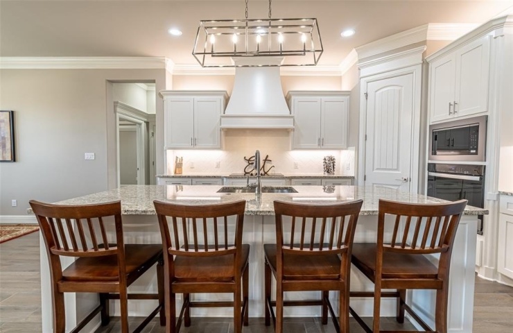 Stylish kitchen blends modern luxury and timeless elegance with the herringbone tile backsplash, custom vent hood, decorative lighting, and oversized granite island for generous prep space.