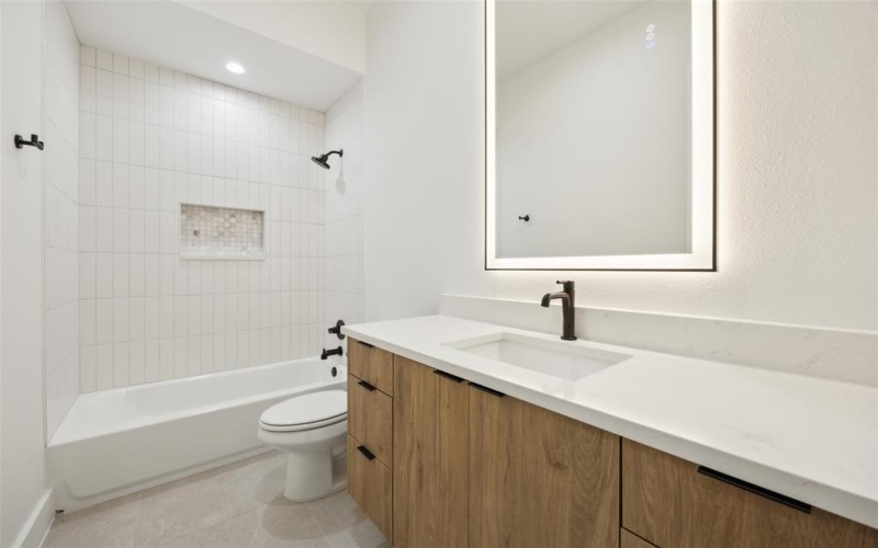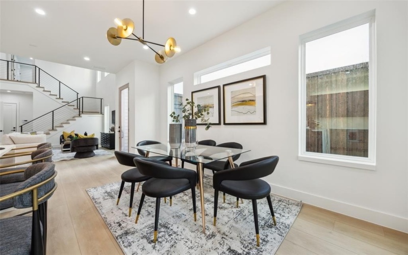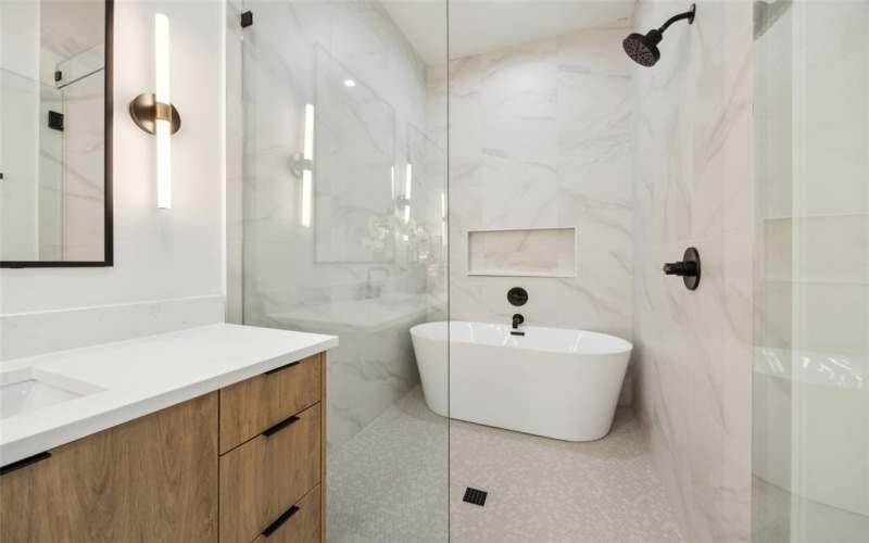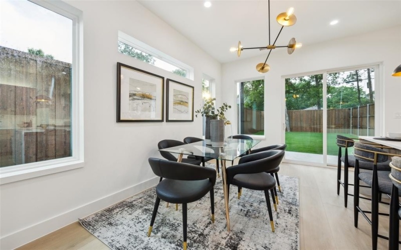 soaking tub in the primary bath. Tall sliding doors open to the inviting backyard, surrounded by an 8-foot privacy fence.