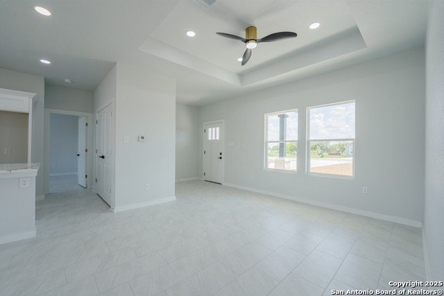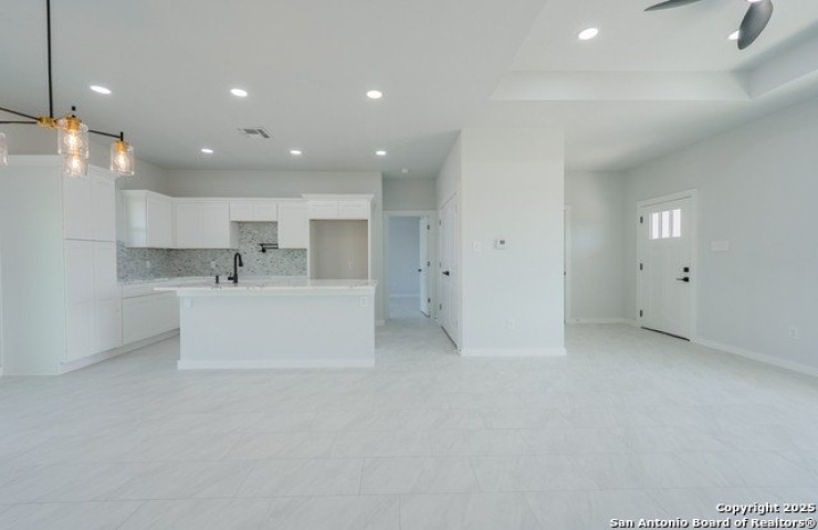 Property Description: This brand-new single-story home sits on a spacious one-acre lot and beautifully blends modern design with inviting comfort. As you arrive, the stone-front exterior with bold black trim and a large covered patio immediately sets the tone for a home that is both stylish and welcoming. Step inside and you're greeted by 9 foot ceiling with an open-concept floor plan where natural light pours in through double-pane windows. The living room makes an instant impression with its tray ceiling, recessed lighting, and a sleek black and gold ceiling fan. Just beyond, the dining space features a contemporary black and gold hanging fixture, offering the perfect setting for gatherings. At the heart of the home, the gourmet kitchen is a true showpiece. Stunning black and white quartz countertops stretch across a center island with seating overhang, complemented by a marble mosaic backsplash, all-white cabinetry, stainless steel appliances, and striking black fixtures. It's a space designed to inspire both everyday living and memorable entertaining. The primary suite is tucked away for privacy, featuring its own tray ceiling, recessed lighting, and a modern ceiling fan. The ensuite bath offers a spa-like retreat with a floor-to-ceiling tiled shower, a built-in niche, and a sleek quartz-topped vanity. On the opposite side of the home, you'll find two additional bedrooms, each tiled with modern black and gold light fixtures with additional recessed lighting and ample closet space. They share a stylish full bath with a tiled shower and tub combination, complete with a quartz vanity. Outside, a covered back patio extends your living space into the fresh air, while the full acre of land provides endless possibilities-whether for relaxation, recreation, or future enhancements. With no HOA, the space is truly yours to enjoy. All in a home that has never been lived in. This thoughtfully designed home is ready for its first owner to make it their own. Welcome to a new chapter at 150 Ranchero Way-modern comfort, open space, and Texas charm.