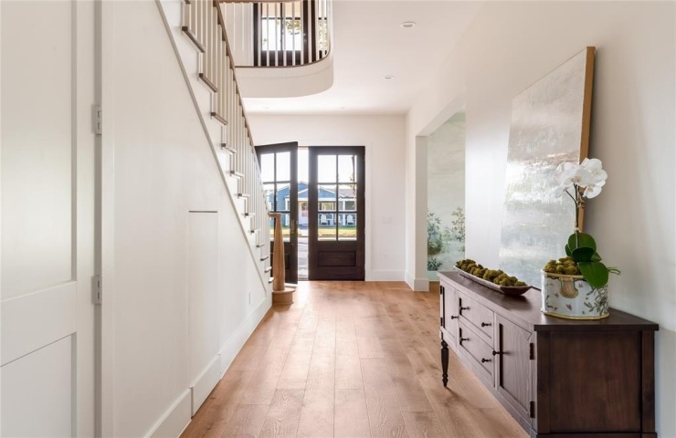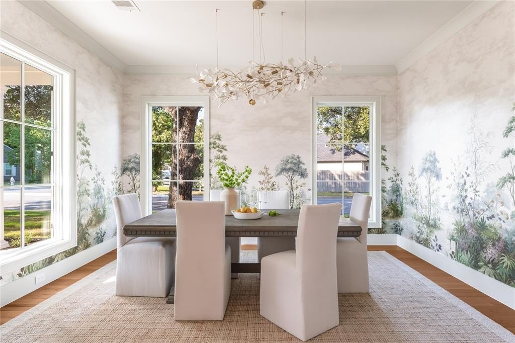 Step inside and be greeted by a breathtaking curved staircase and a formal dining room highlighted by an Anna French mural wallpaper. The chef’s kitchen is a showpiece, featuring marble countertops, a 48-inch gas range, custom cabinetry, and an oak island with seating for six. A butler’s pantry with abundant storage and space for an additional refrigerator connects seamlessly to the dining room through a service hall. The kitchen opens into the expansive living room, anchored by a custom gas fireplace and detailed ceilings.