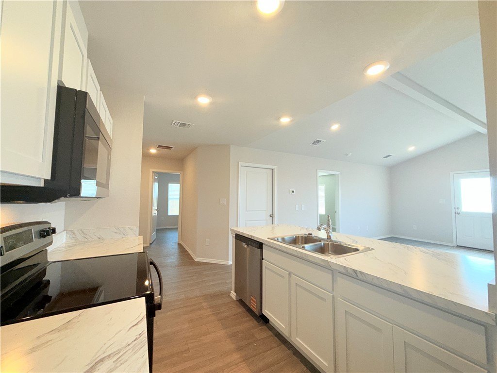 Property Description: Brand-new construction! Be the first to live in this stunning home in Madelyn Estates. The house features vinyl flooring throughout and fresh light gray walls for a modern look. The open floor plan is perfect for keeping conversations flowing between the living, dining, and kitchen areas. The living room offers a high, peaked ceiling with a beam and recessed lighting for added charm. The galley kitchen comes equipped with Formica countertops, sleek white cabinets, and black and stainless-steel appliances, including a stove/oven range, dishwasher, built-in microwave, and disposal. The split floor plan ensures privacy, with the primary bedroom and bath separated from the smaller bedrooms. The primary bathroom includes a tub/shower combo, a walk-in closet, and dual vanity sinks. A separate laundry room is conveniently located off the kitchen. The home also features 2" faux blinds throughout, a spacious backyard with privacy cedar fencing, and a two-car garage with an opener.
