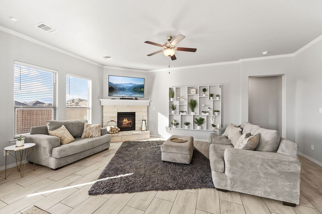 Property Description: This stunning 4-bedroom, 2-bath home offers the perfect blend of style, comfort, and functionality. The open-concept layout features a gorgeous kitchen with an oversized breakfast bar that flows seamlessly into the spacious living area, highlighted by a cozy gas fireplace and abundant natural light. The sequestered primary suite provides a private retreat, while the large backyard—with no rear neighbors—offers the ideal space for outdoor enjoyment. See it today!