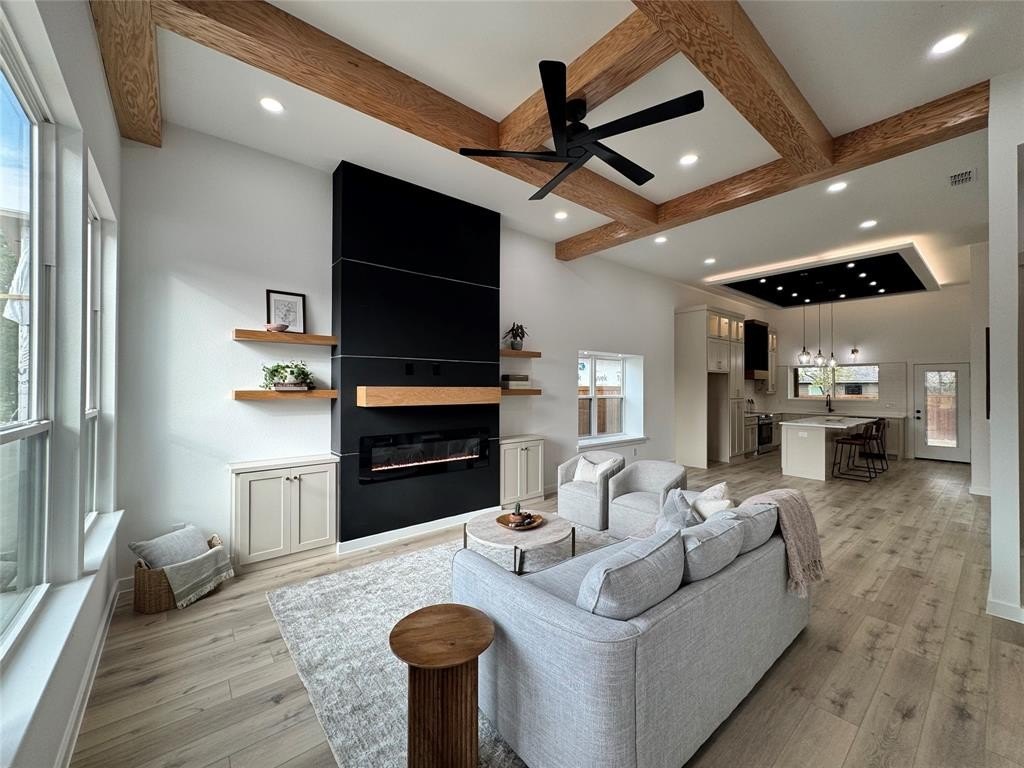 Property Description: Welcome to your dream home, a stunning Custom Contemporary Modern masterpiece designed for comfort and style. Step inside and be captivated by the impressive high ceilings and the peaceful, private yard where you can unwind with breathtaking sunsets every evening in your unique custom made lit metal pergola for bonfires and family gatherings this fall season. Inside, you'll find 3 generously sized bedrooms and 2 baths all conveniently located and thoughtfully arranged with an open-concept layout. The kitchen is uniquely inspired to standout, complete with white finish Quartz countertops, a island ideal for casual dining, and stylish custom lighting finishes throughout. Luxury Vinyl Plank floors flow seamlessly through the common areas, enhancing the home's contemporary feel and carpet in the bedrooms. The living area was designed for your entertainment including an electric fireplace ready for relaxing evenings while you enjoy the sunset view from your main entry oversized windows. The home provides, ample storage by having large closets, and a conveniently located mud room built in area beside the laundry room. Additional conveniences like added accent lighting in garage, stove, microwave, dishwasher, new wood privacy fence ensure hassle-free living, making this home a statement of comfort, privacy and style. A must see, schedule a tour today.
