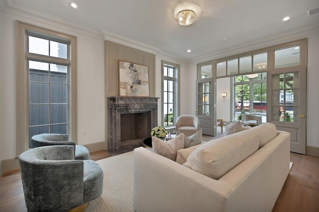 Exterior highlights include slate roofing, lime-wash brick, and steel-clad windows, setting a tone of understated European elegance. Inside, discover honed Italian marble countertops, a La Cornue range, Wolf + Sub-Zero appliances, and dual primary baths featuring heated marble floors and a steam shower spa retreat. Thoughtful details like arched hallways, custom millwork, and designer lighting elevate the everyday experience.