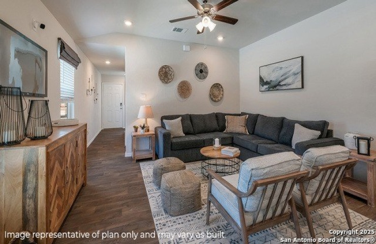 Property Description: The Diana plan is our largest one-story home offered in Applewood in San Antonio, TX.  Featuring 2 classic front exteriors, 3 bedrooms, 2 baths, 2-car garage and 1535 square feet of living space, this floor plan is sure to turn heads.    Comfort greets you at the door with a long foyer leading to a combined living and dining area, then flowing into the grand corner kitchen. The kitchen includes a breakfast bar with beautiful granite counter tops, stainless steel appliances, shaker style cabinetry and a corner pantry with built-in shelving.    Your blended family room and dining area feature quality sheet vinyl flooring and plenty of windows, creating a light and bright space for living and entertaining.     The main bedroom is located at the back of the home and has its own attached bathroom that offers a separate water closet, tiled walk-in shower and spacious walk-in closet.     All secondary bedrooms offer quality carpeted floors and a closet.  These rooms are versatile.  Use them as bedrooms, offices, work out rooms or other bonus spaces.    The Diana floor plan also includes granite countertops in all bathrooms, full yard landscaping and irrigation, and our HOME IS CONNECTED base package.  Using one central hub that talks to all the devices in your home, you can control the lights, thermostat and locks, all from your cellular device.