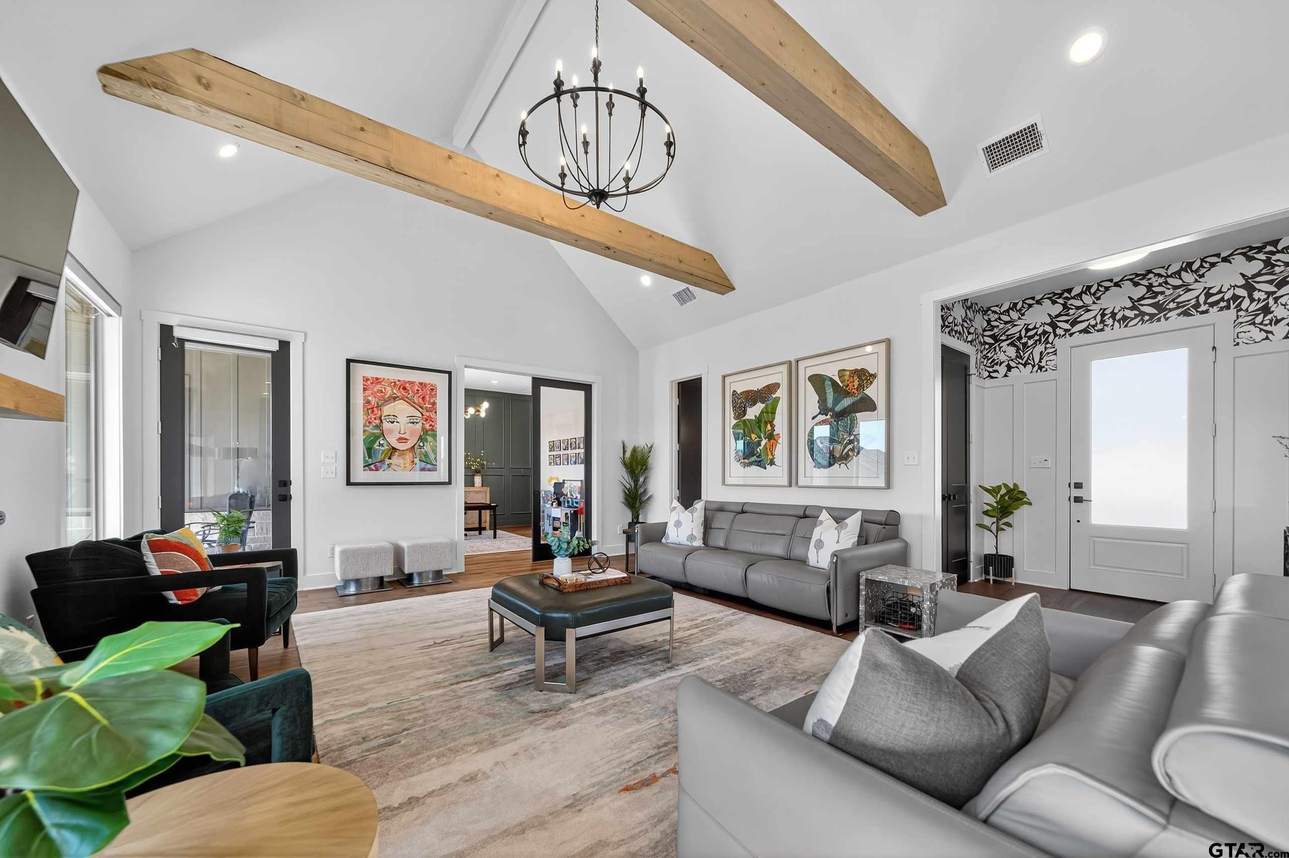 Property Description: Looking for a captivating, modern design with gorgeous textures and a fabulous floor plan? This 2024 Parade of Homes, single story property, has all the design elements a buyer could want! Vaulted ceilings, custom lighting, beautiful flooring and stunning windows make this open concept home come to life! Wonderful kitchen, with no detail missed, offers custom cabinetry, large breakfast bar that doubles as an island, drop in range that is plumbed for gas or can remain electric, ample storage and walk in panty! Split primary is a fabulous escape with soaring ceilings, large walk in closet with his/her built ins and luxurious primary bath boasting large freestanding bath, gorgeous tiled shower and his/her vanities! Three additional guest bedrooms are each oversized with walk in closets! One bedroom has direct access to private bath while the two additional bedrooms share a large jack-n-jill bath! Secondary living space could serve multiple functions as a play room, office or more entertaining space! Step outside to the large covered patio and spacious fenced yard! This corner lot home sits on a quiet cul-de-sac inside Oak Creek! With direct access to Tyler Racquet Club, the new owners can enjoy swimming, tennis, workouts, pickle-ball and the cafe! Sellers installed $13K worth of custom, motorized shades throughout the property and added soffit outlets to the exterior! Don't miss this designers dream, priced competitively and ready for new owners!